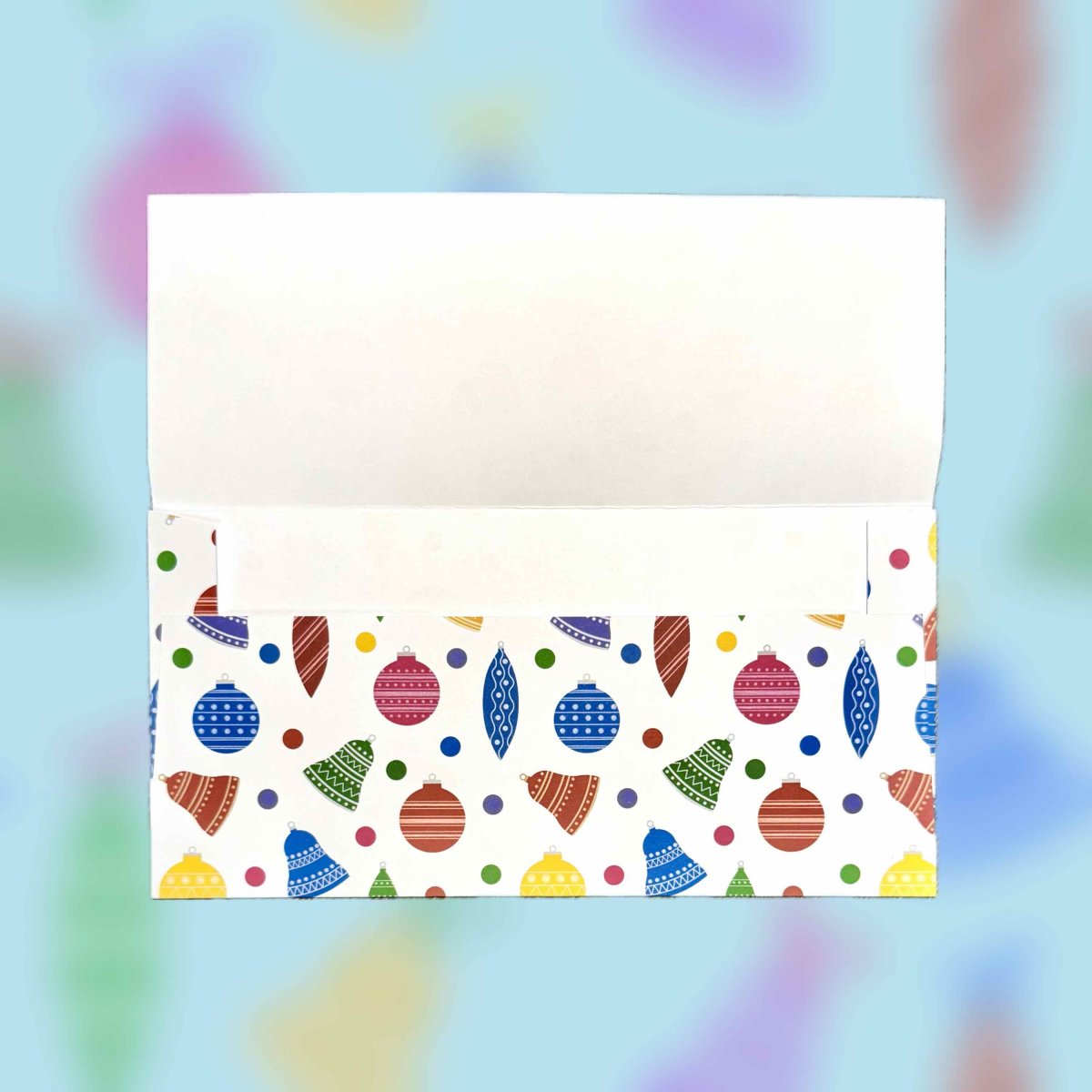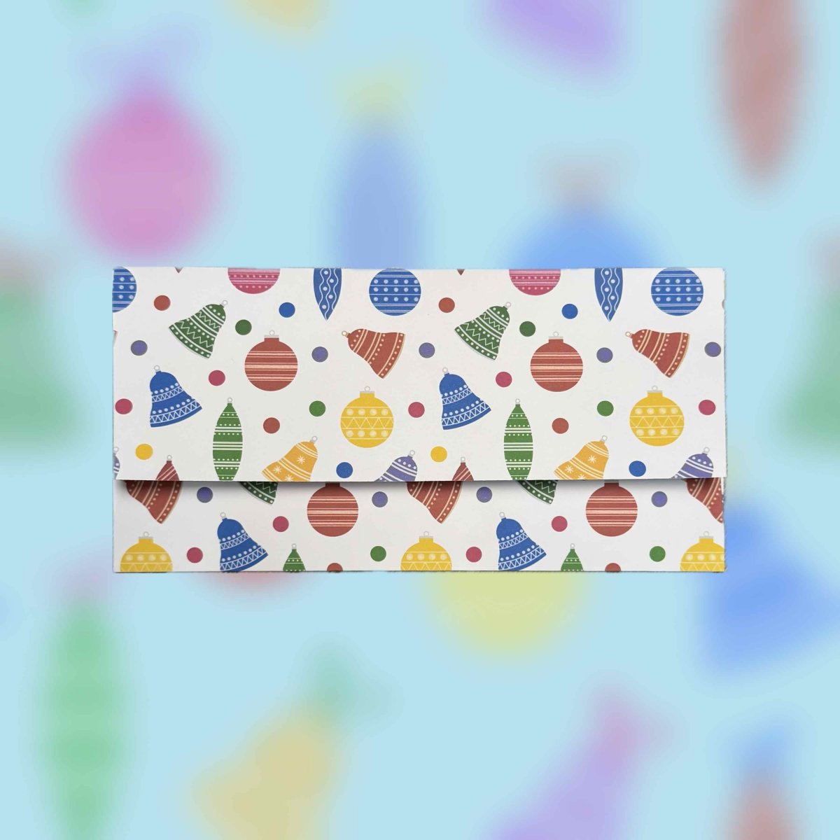 Papírová darovací ručně skládaná obálka s potiskem autorskou grafikou s vánočními ozdobami na bílém pozadí. Drobný vzor. Obálka z bílého papíru gramáže 160 g/m2 s inkoustovým potiskem.