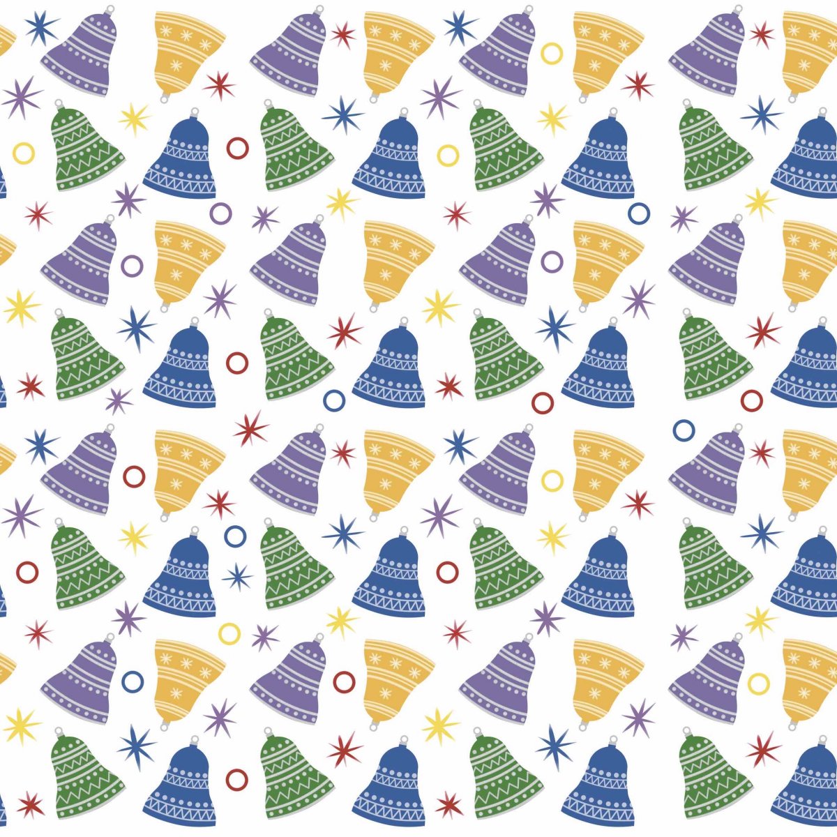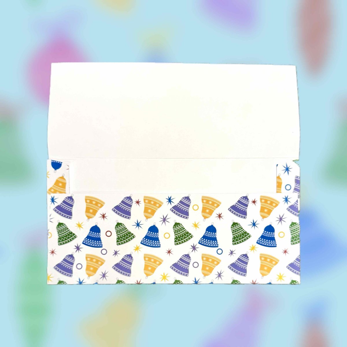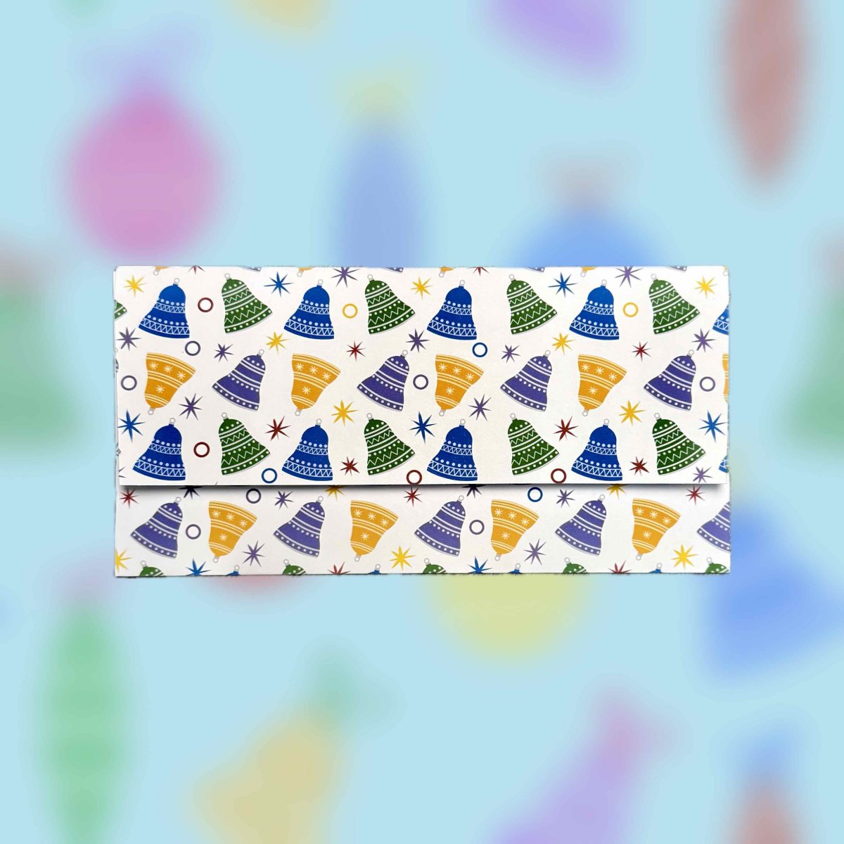 Papírová darovací ručně skládaná obálka s potiskem autorskou grafikous vánočními ozdobami - zvonky na bílém pozadí. Drobný vzor. Obálka z bílého papíru gramáže 160 g/m2 s inkoustovým potiskem.