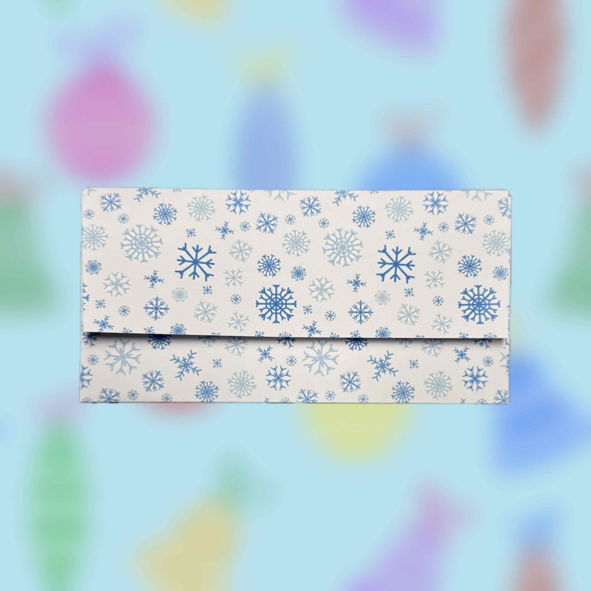 Papírová darovací ručně skládaná obálka s potiskem autorskou grafikou se sněhovými vločkami na bílém pozadí. Drobný vzor. Obálka z bílého papíru gramáže 160 g/m2 s inkoustovým potiskem.