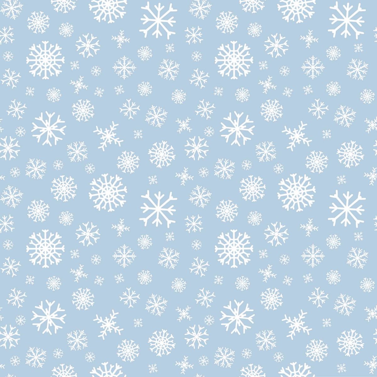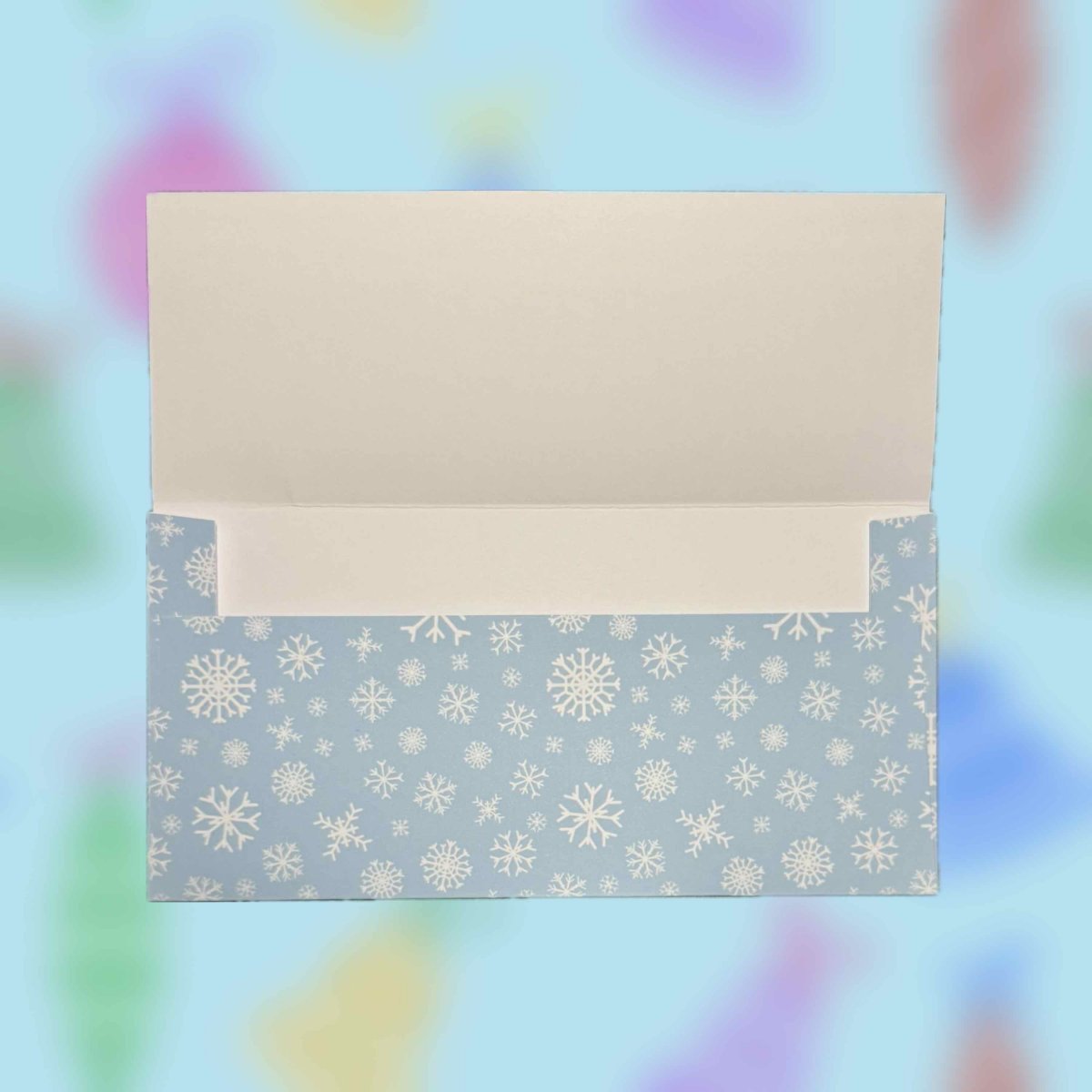 Papírová darovací ručně skládaná obálka s potiskem autorskou grafikou s bílými sněhovými vločkami na světle modrém pozadí. Drobný vzor. Obálka z bílého papíru gramáže 160 g/m2 s inkoustovým potiskem.