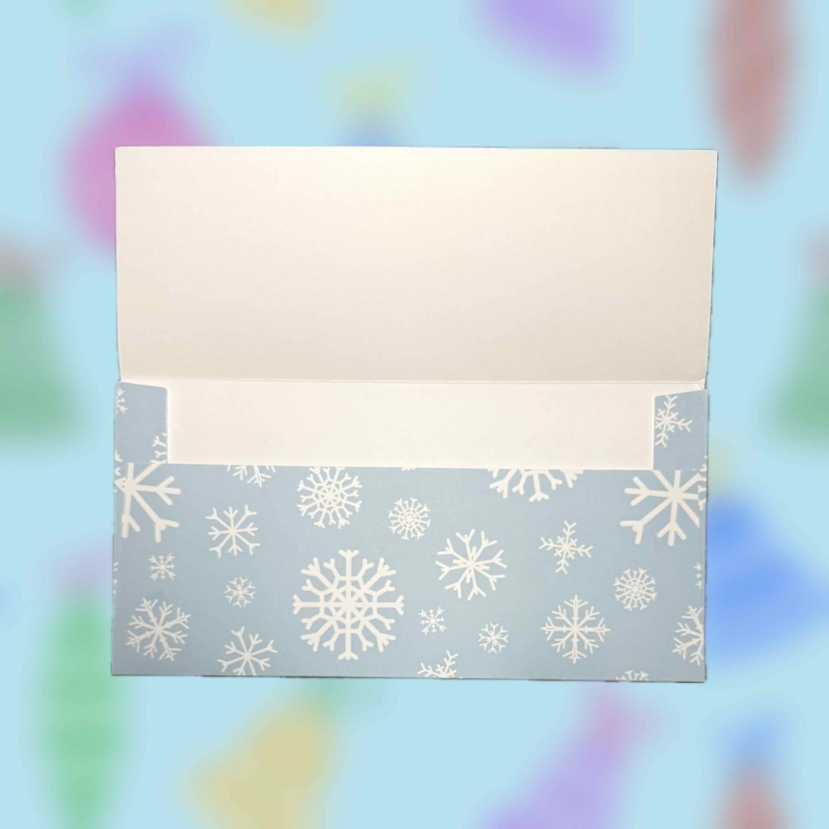 Papírová darovací ručně skládaná obálka s potiskem autorskou grafikou s bílými sněhovými vločkami na světle modrém pozadí. Velký vzor. Obálka z bílého papíru gramáže 160 g/m2 s inkoustovým potiskem.