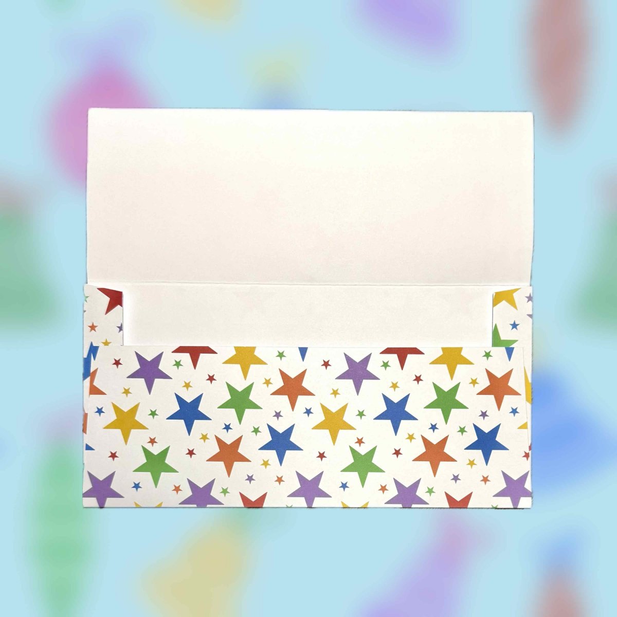 Papírová darovací ručně skládaná obálka s potiskem autorskou grafikou s barevnými velkými hvězdičkami na bílém pozadí. Obálka z bílého papíru gramáže 160 g/m2 s inkoustovým potiskem.