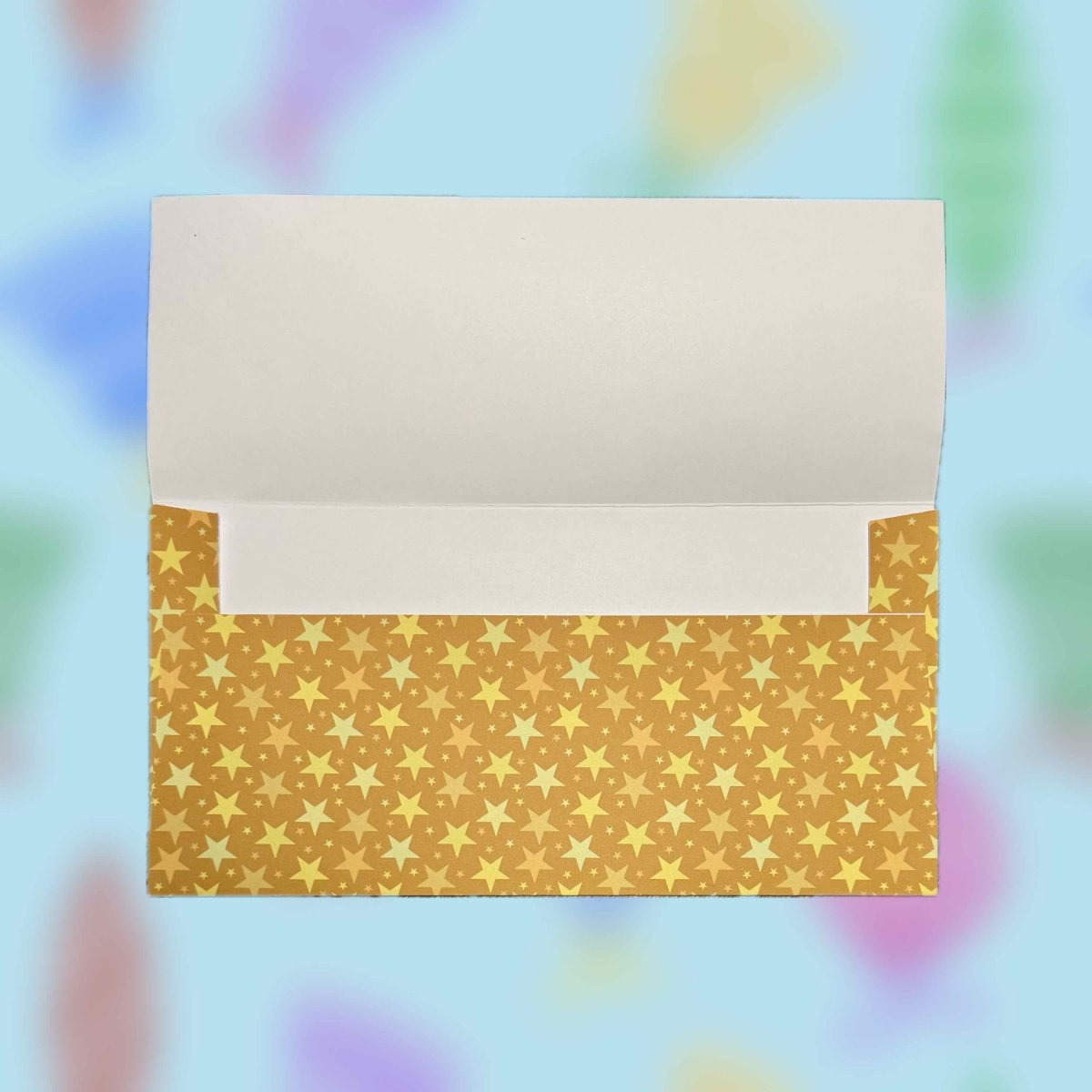 Papírová darovací ručně skládaná obálka s potiskem autorskou grafikou se žlutými a zlatými drobnými hvězdičkami na zlatém pozadí. Obálka z bílého papíru gramáže 160 g/m2 s inkoustovým potiskem.