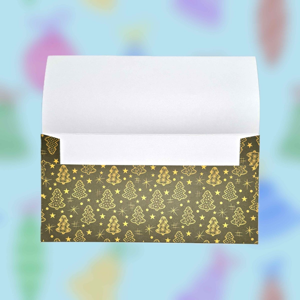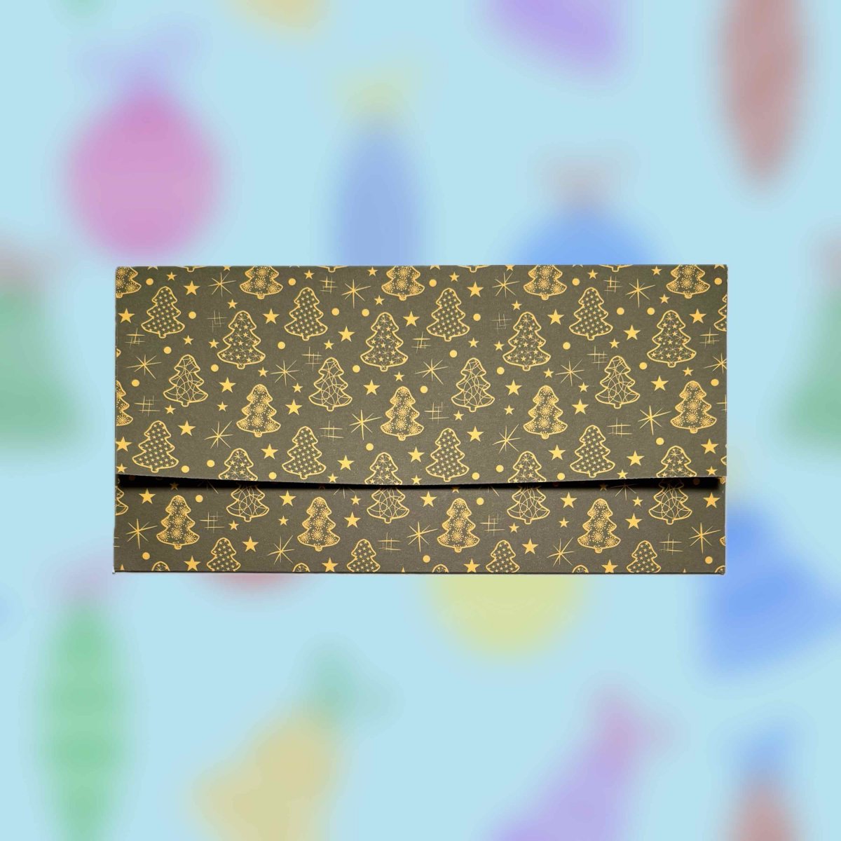 Papírová darovací ručně skládaná obálka s potiskem autorskou grafikou se žlutými různými stromečky na khaki zeleném pozadí. Obálka z bílého papíru gramáže 160 g/m2 s inkoustovým potiskem.