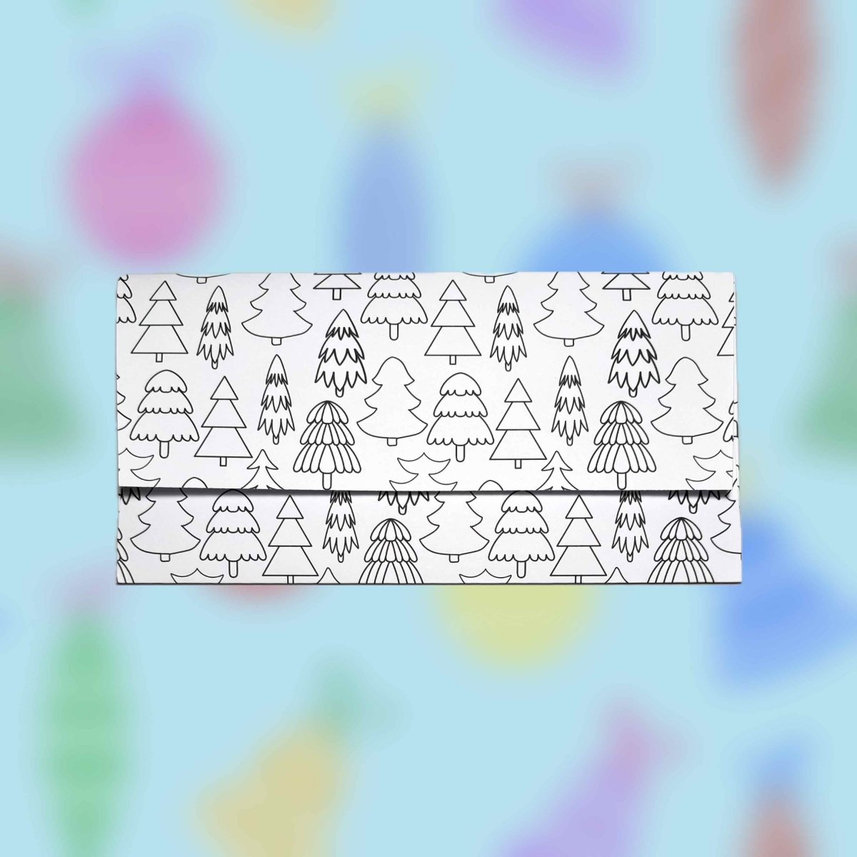 Papírová darovací ručně skládaná obálka s potiskem autorskou grafikou s černobílými obrysovými různě tvarovanými stromky ve stylu omalovánek. Obálka z bílého papíru gramáže 160 g/m2 s inkoustovým potiskem.