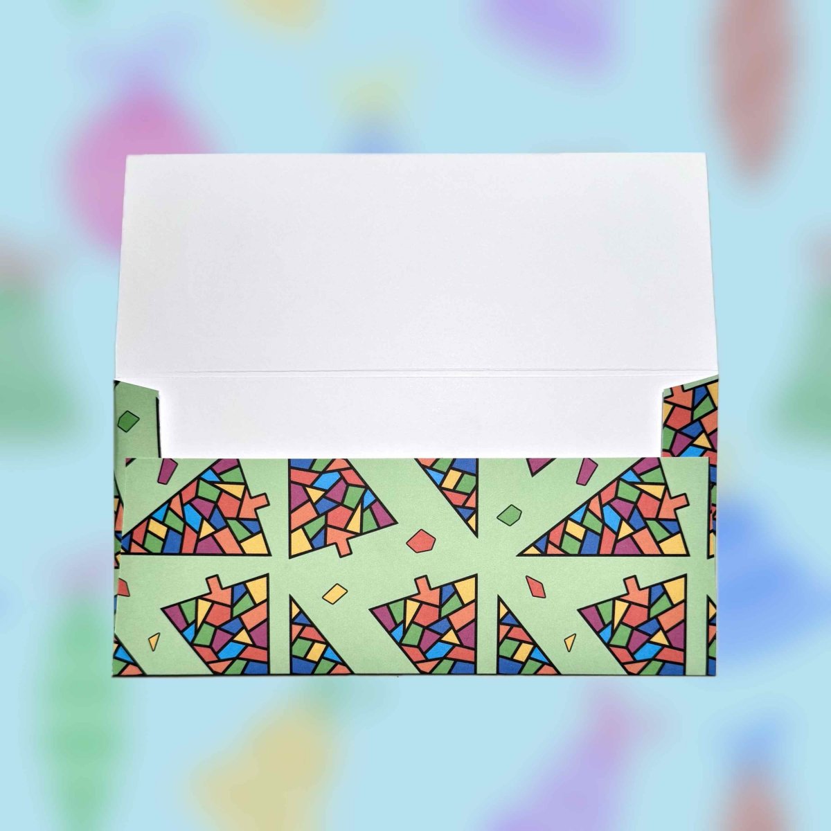 Papírová darovací ručně skládaná obálka s potiskem autorskou grafikou s motivem vitrážových trojúhelníkových vánočních stromků na hráškově zeleném pozadí. Obálka z bílého papíru gramáže 160 g/m2 s inkoustovým potiskem.