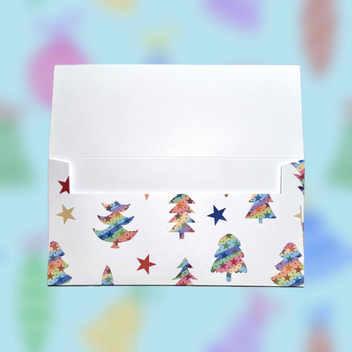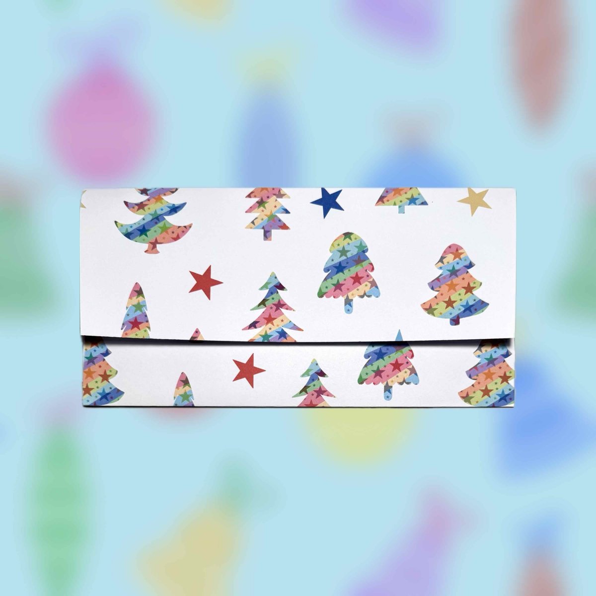Papírová darovací ručně skládaná obálka s potiskem autorskou grafikou s motivem různě tvarovaných stromků v duhových barvách s hvězdičkami na bílém pozadí - velký vzor. Obálka z bílého papíru gramáže 160 g/m2 s inkoustovým potiskem.