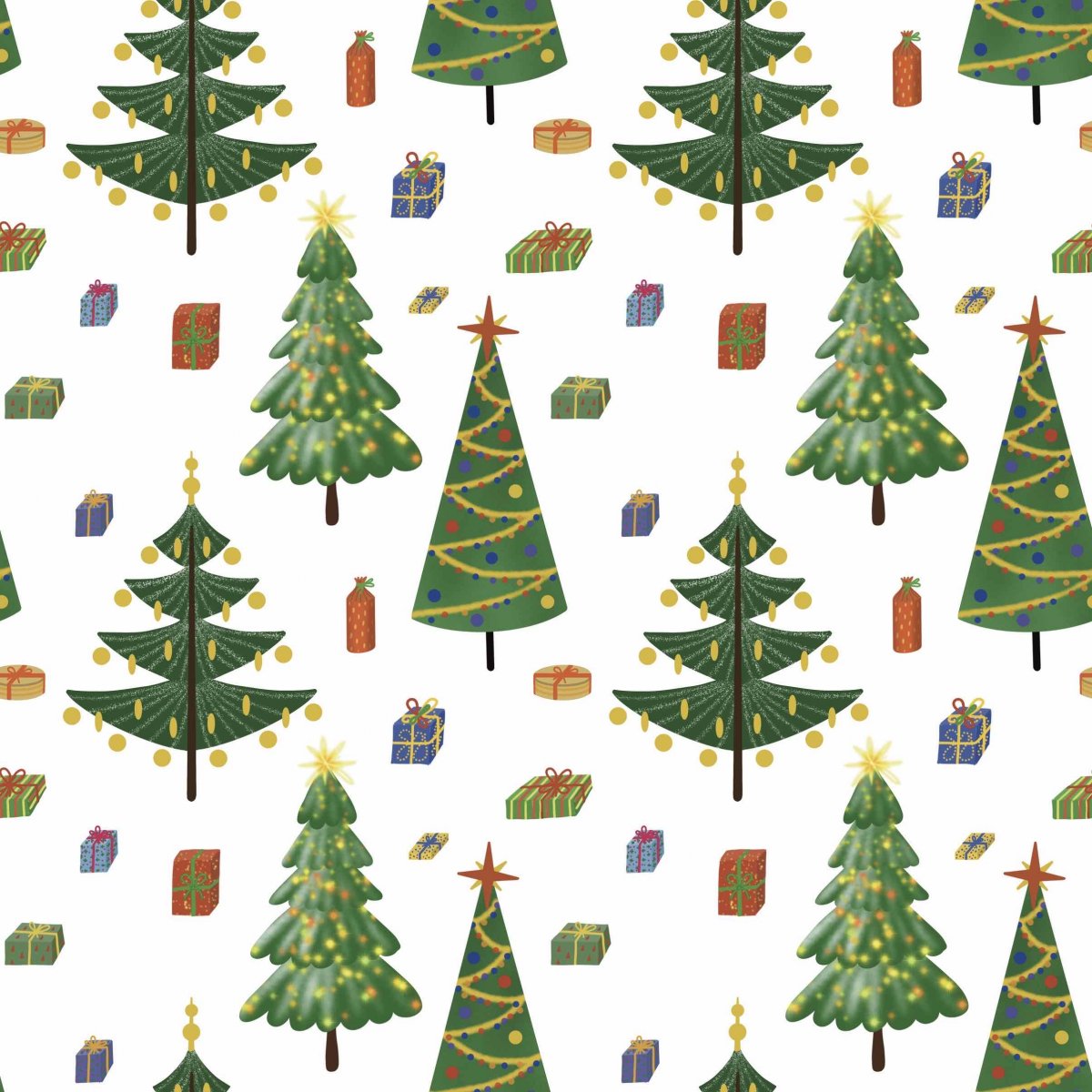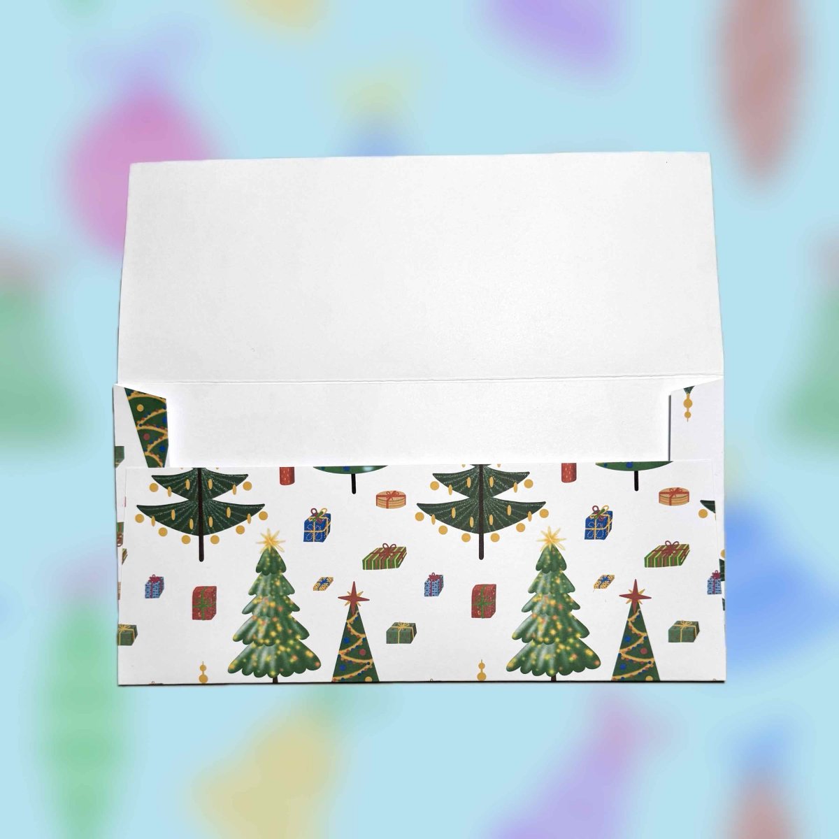 Papírová darovací ručně skládaná obálka s potiskem autorskou grafikou s motivem zdobených vánočních stromků s dárky na bílém pozadí - velký vzor. Obálka z bílého papíru gramáže 160 g/m2 s inkoustovým potiskem.