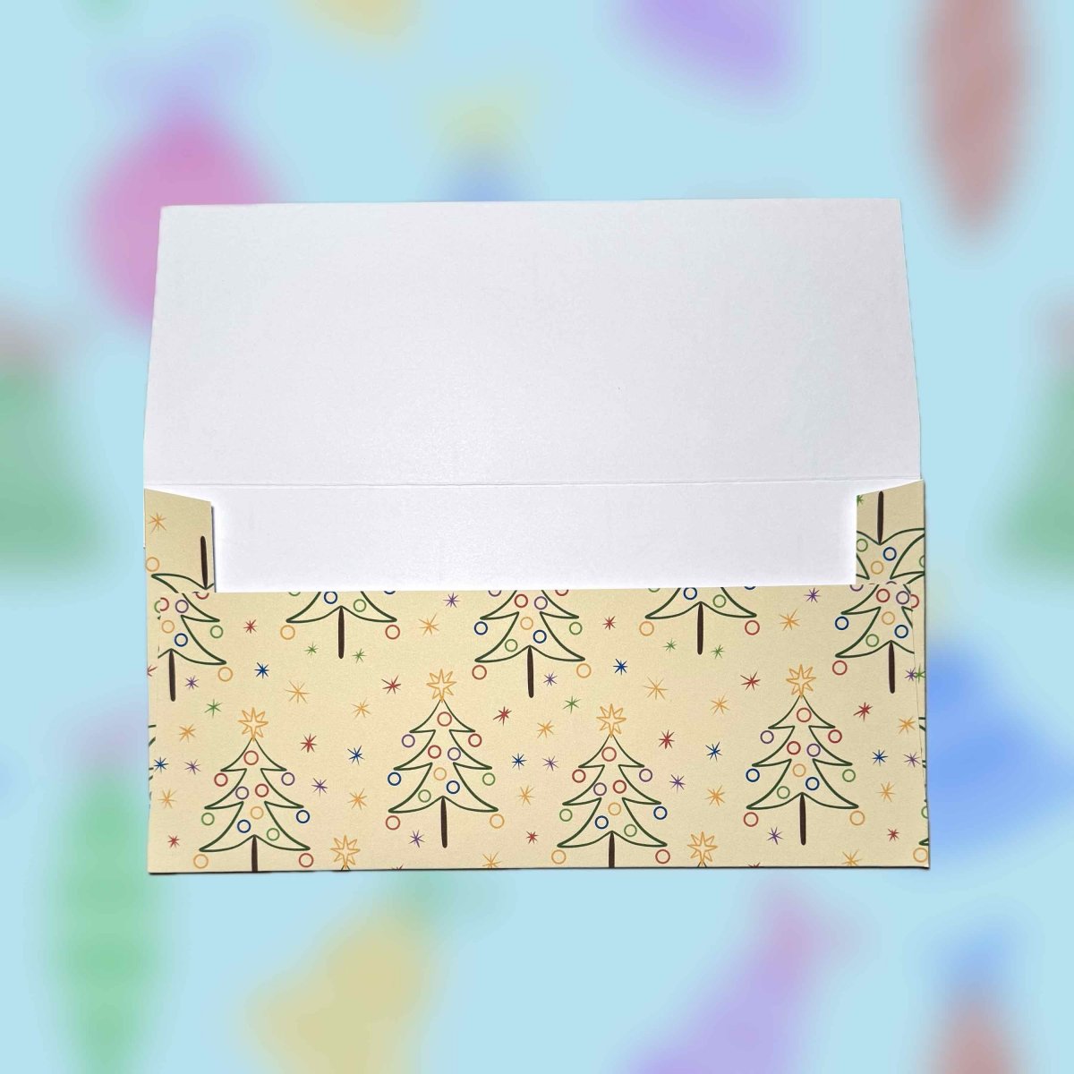 Papírová darovací ručně skládaná obálka s potiskem autorskou grafikou s motivem jednoduchých zdobených vánočních stromků s hvězdičkami na světle žlutém pozadí. Obálka z bílého papíru gramáže 160 g/m2 s inkoustovým potiskem.