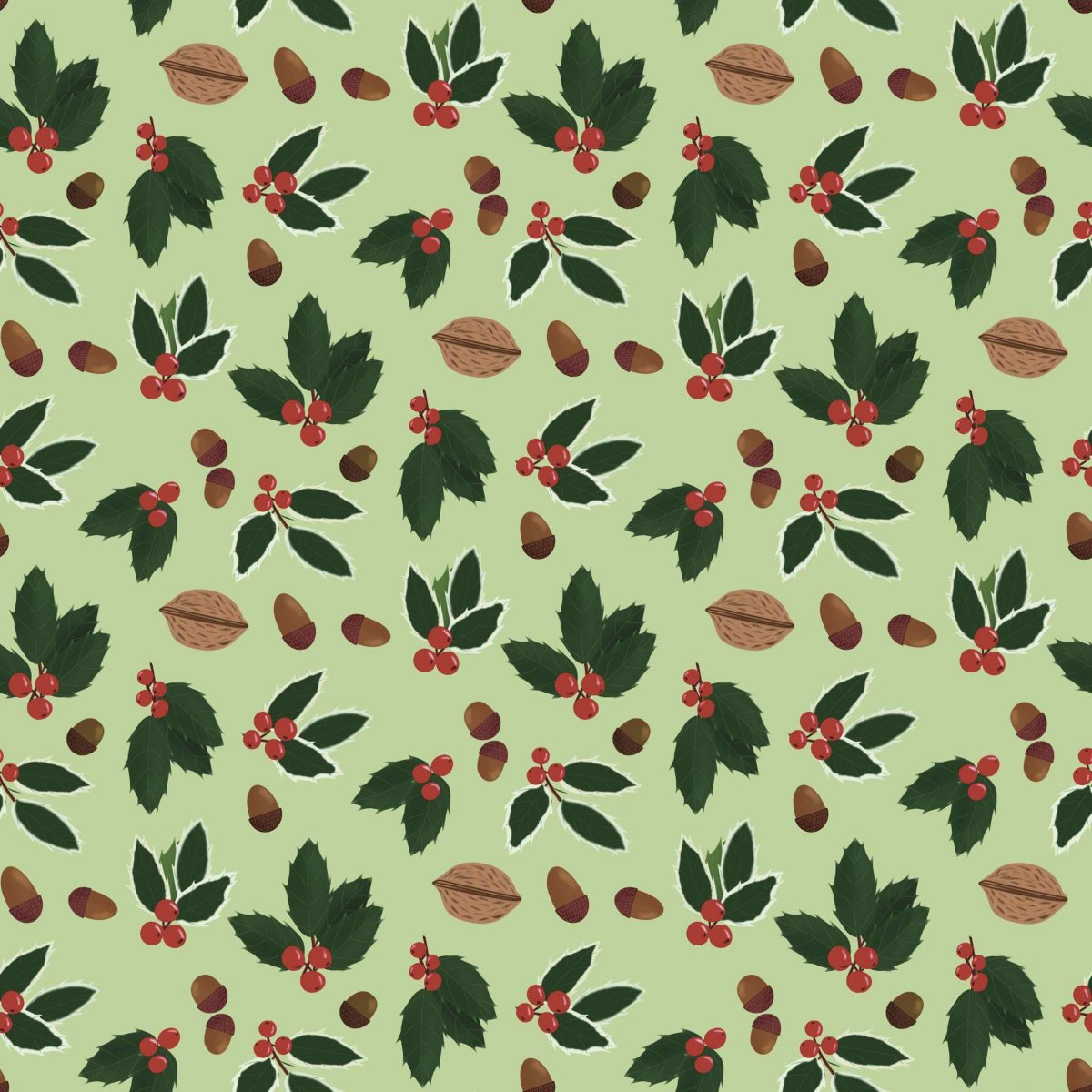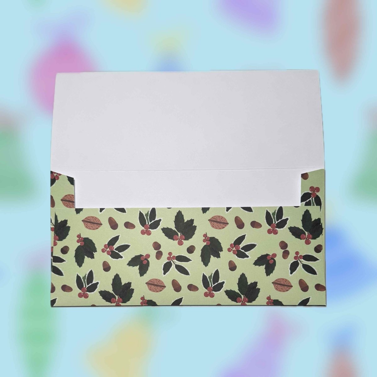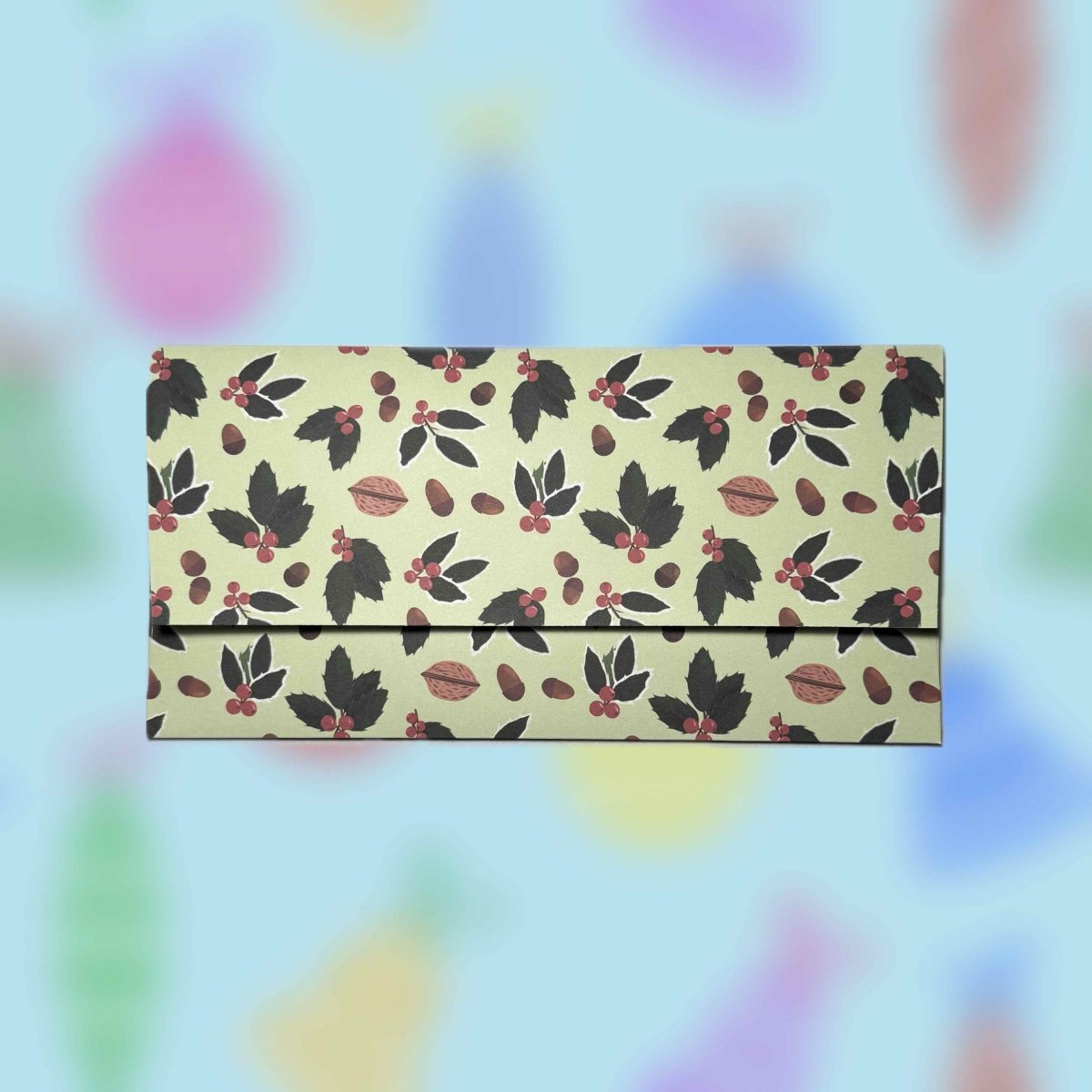 Papírová darovací ručně skládaná obálka s potiskem autorskou grafikou s motivem větviček zelené cesmíny s červenými plody, vlašskými ořechy a žaludy na zeleném pozadí - drobný vzor. Obálka z bílého papíru gramáže 160 g/m2 s inkoustovým potiskem.