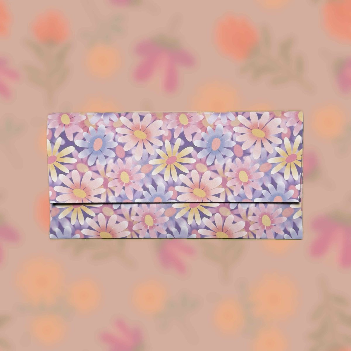Papírová darovací ručně skládaná obálka s potiskem autorskou grafikou s motivem mnoha abstraktních květů ve světle modré, žluté, růžové a oranžové barvě na fialovém pozadí. Obálka z bílého papíru gramáže 160 g/m2 s inkoustovým potiskem.