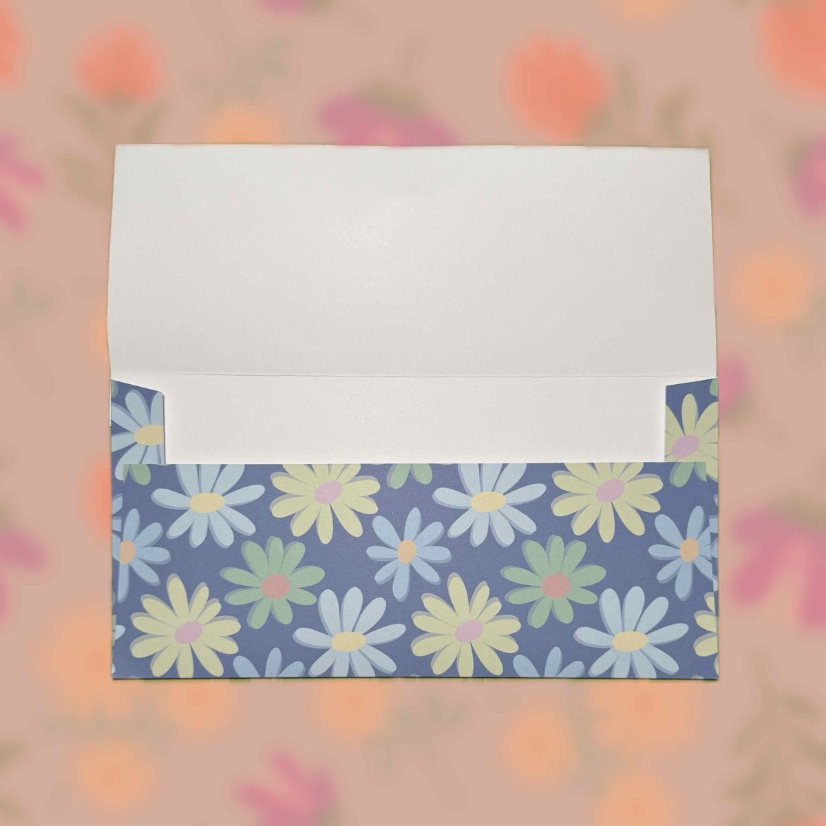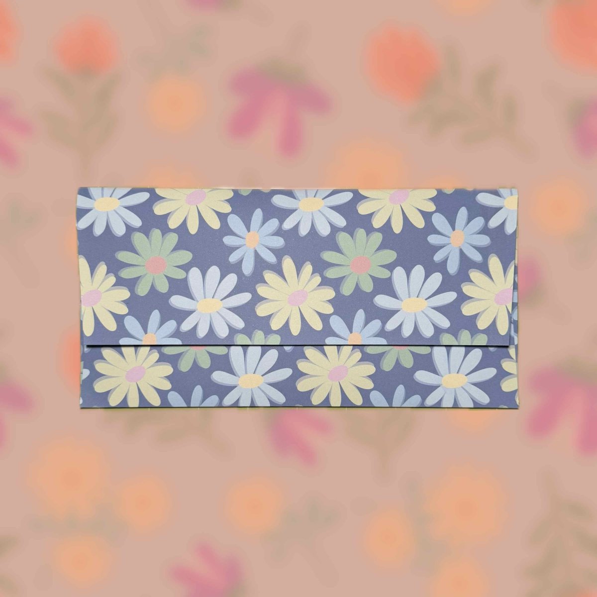 Papírová darovací ručně skládaná obálka s potiskem autorskou grafikou s motivem skupiny abstraktních kopretin ve modré, žluté a zelené barvě na světle modrém pozadí. Obálka z bílého papíru gramáže 160 g/m2 s inkoustovým potiskem.
