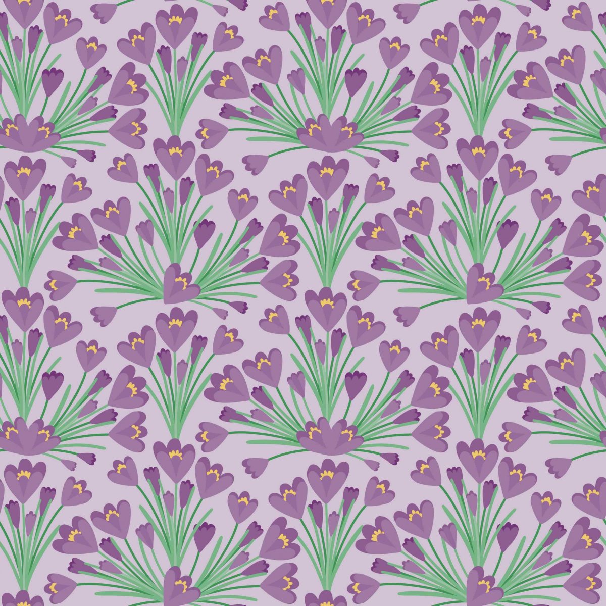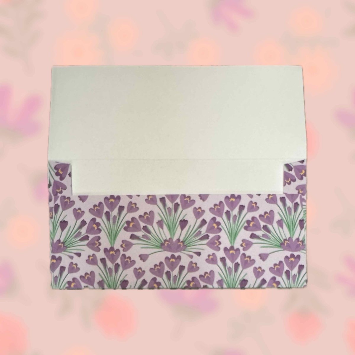 Papírová darovací ručně skládaná obálka s potiskem autorskou grafikou s motivem abstraktních kvetoucích tmavě fialových krokusů na světle fialovém pozadí. Obálka z bílého papíru gramáže 160 g/m2 s inkoustovým potiskem.