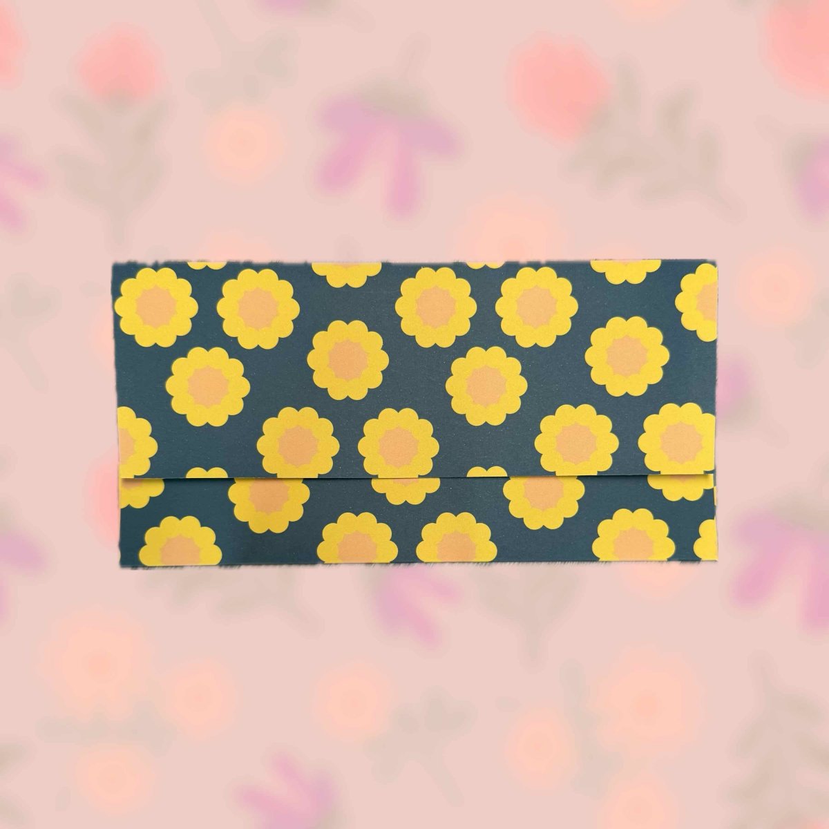 Papírová darovací ručně skládaná obálka s potiskem autorskou grafikou se žlutými retro květy na tmavém modro-zeleném pozadí pozadí. Obálka z bílého papíru gramáže 160 g/m2 s inkoustovým potiskem.