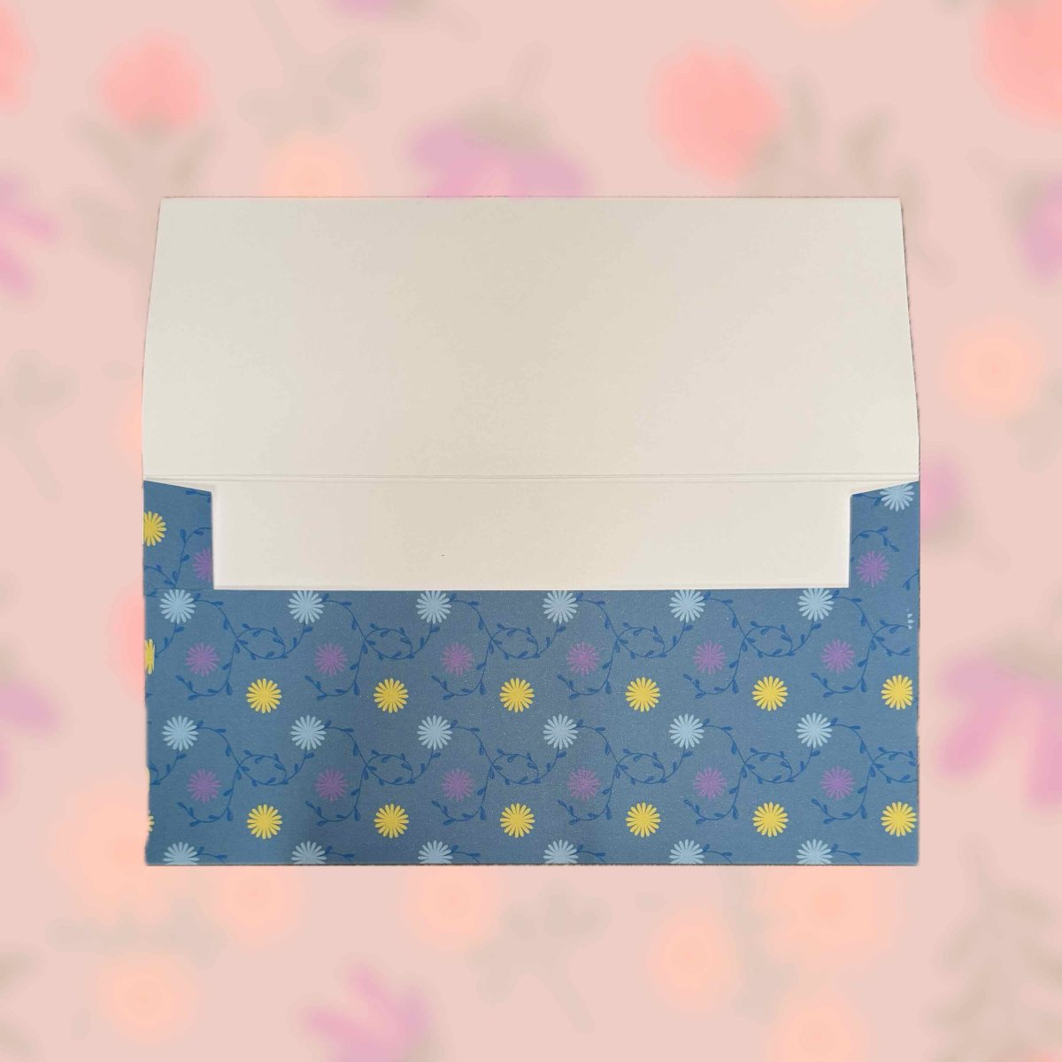 Papírová darovací ručně skládaná obálka s potiskem autorskou grafikou s drobnými žlutými, světle modrými a růžovými kvítky na šedomodrém pozadí. Obálka z bílého papíru gramáže 160 g/m2 s inkoustovým potiskem.