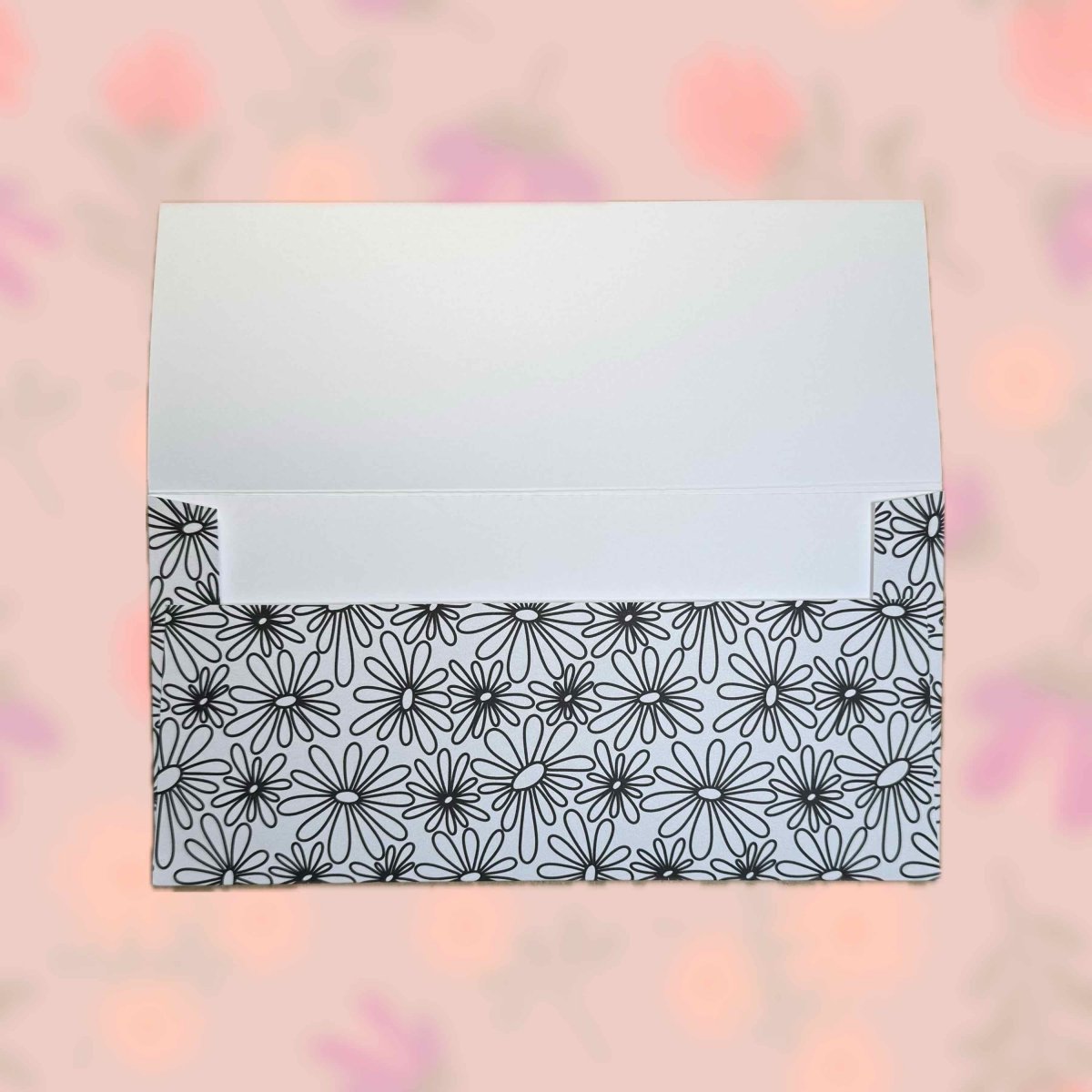 Papírová darovací ručně skládaná obálka s potiskem autorskou grafikou s abstraktními černo-bílými květy s možností dobarvení - vybarvovánky - malý vzor. Obálka z bílého papíru gramáže 160 g/m2 s inkoustovým potiskem.
