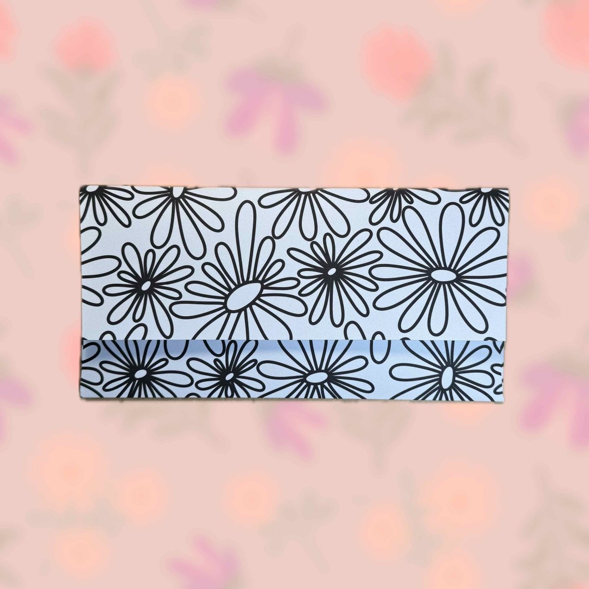 Papírová darovací ručně skládaná obálka s potiskem autorskou grafikou s abstraktními černo-bílými květy s možností dobarvení - vybarvovánky - velký vzor. Obálka z bílého papíru gramáže 160 g/m2 s inkoustovým potiskem.