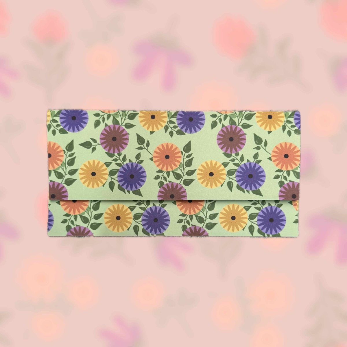 Papírová darovací ručně skládaná obálka s potiskem autorskou grafikou s barevnými retro květy s lístky na hráškově zeleném pozadí. Obálka z bílého papíru gramáže 160 g/m2 s inkoustovým potiskem.