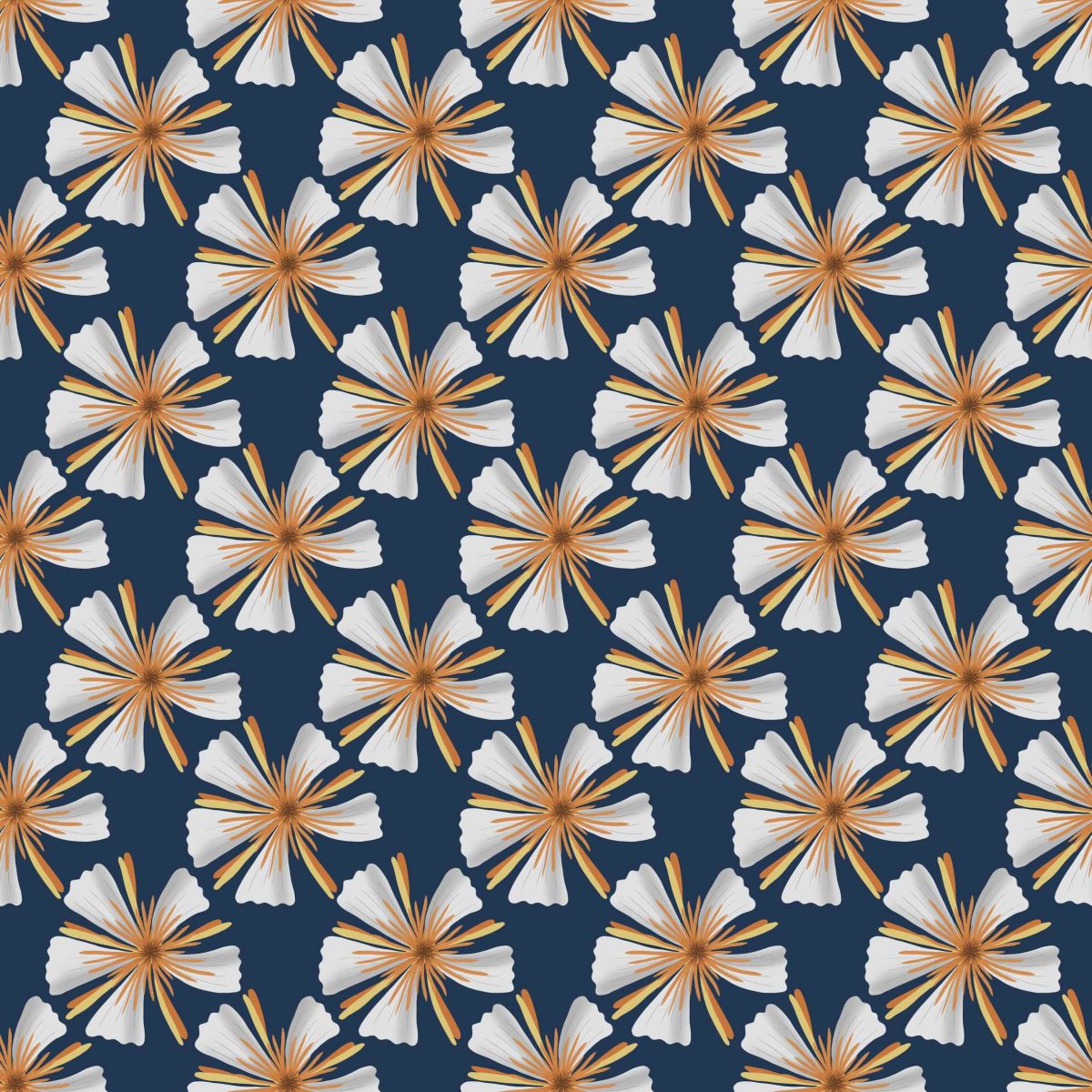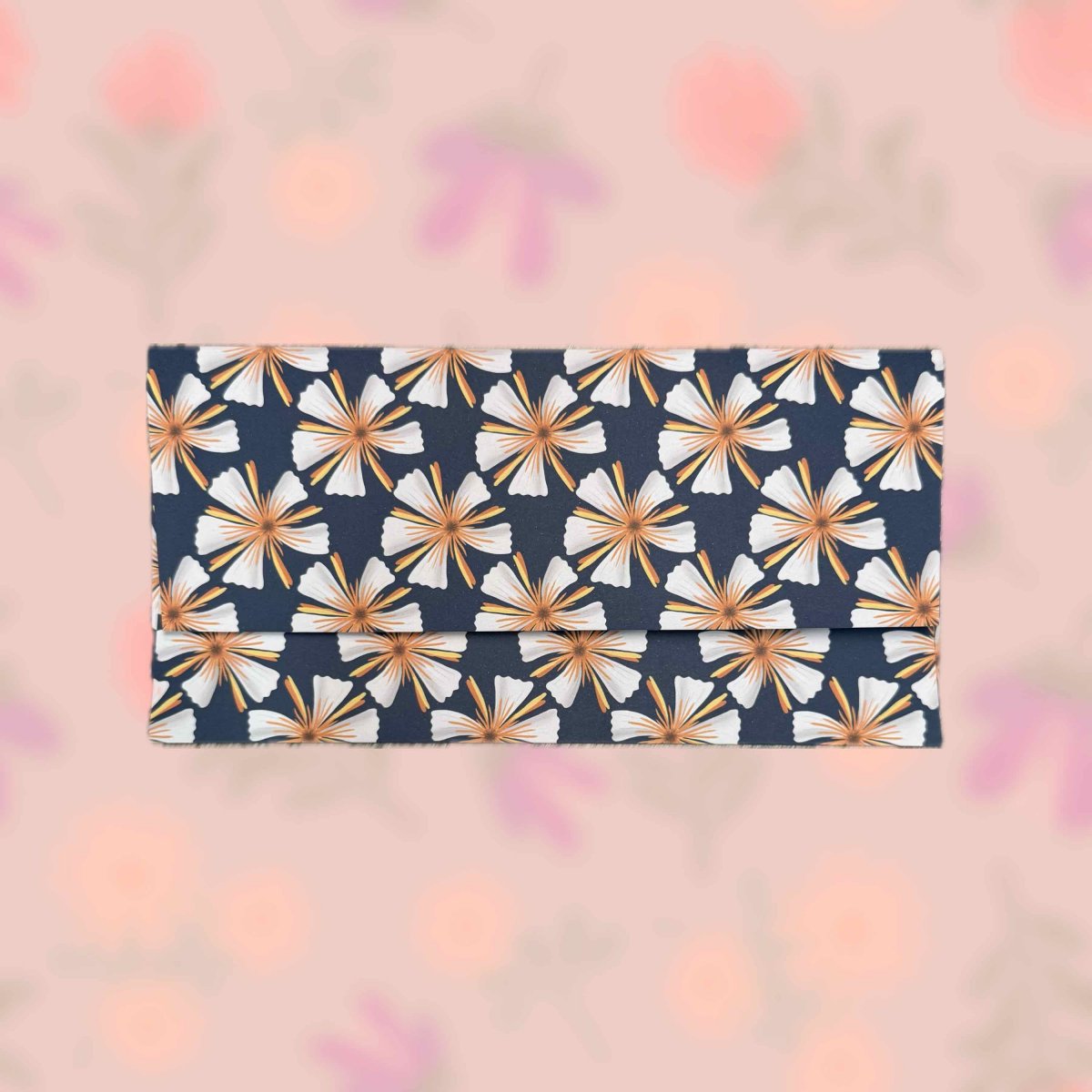 Papírová darovací ručně skládaná obálka s potiskem autorskou grafikou s abstraktními bílými květy na tmavě modrém pozadí. Obálka z bílého papíru gramáže 160 g/m2 s inkoustovým potiskem.
