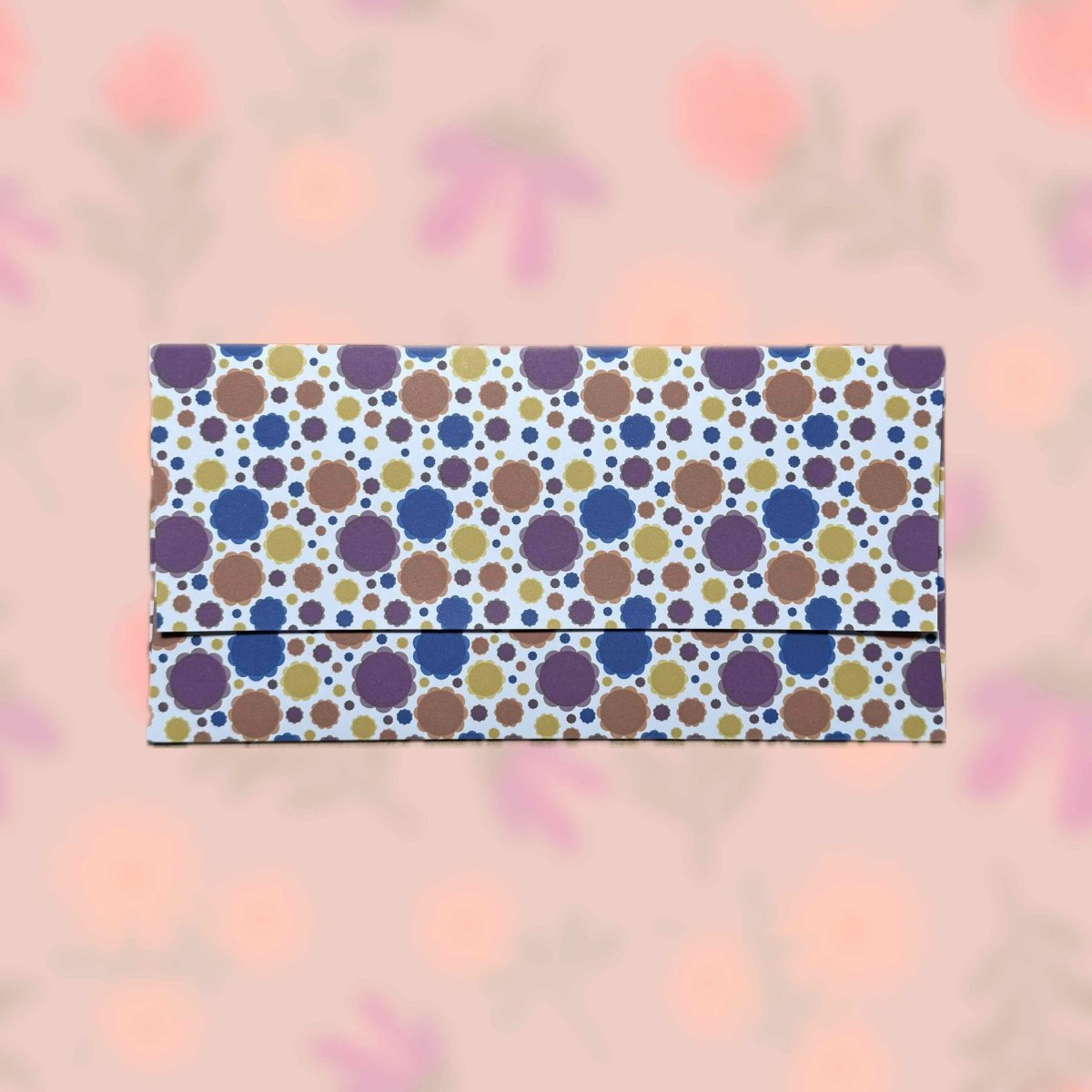 Papírová darovací ručně skládaná obálka s potiskem autorskou grafikou - sytě barevné retro květy na bílém pozadí - drobný vzor. Obálka z bílého papíru gramáže 160 g/m2 s inkoustovým potiskem.