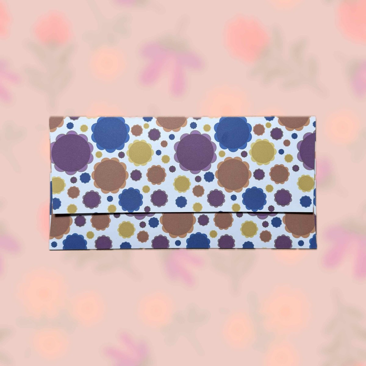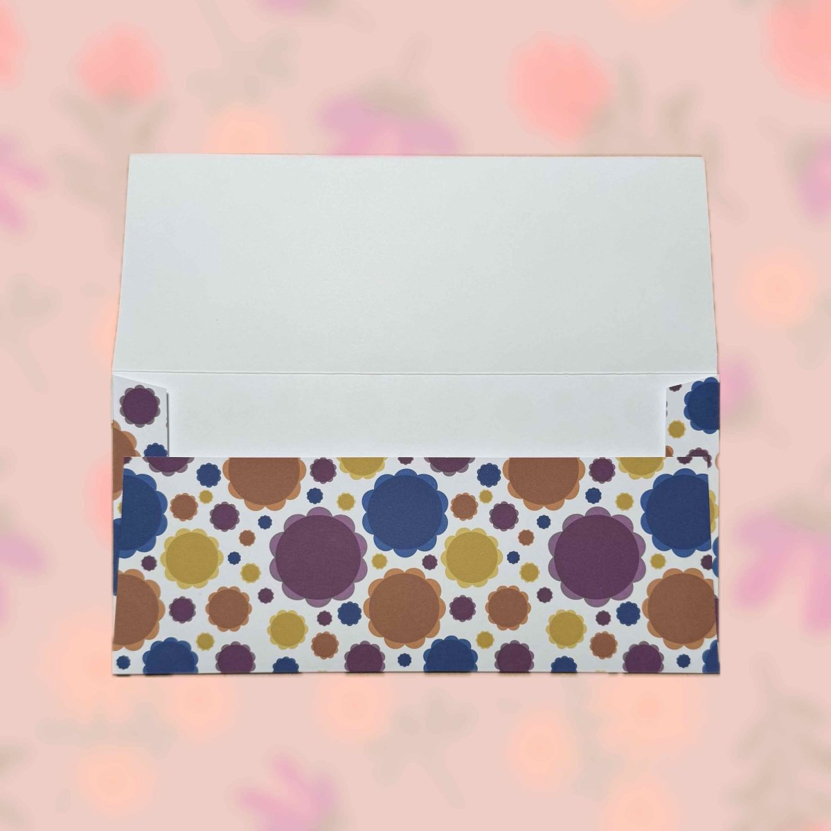 Papírová darovací ručně skládaná obálka s potiskem autorskou grafikou - sytě barevné retro květy na bílém pozadí - velký vzor. Obálka z bílého papíru gramáže 160 g/m2 s inkoustovým potiskem.