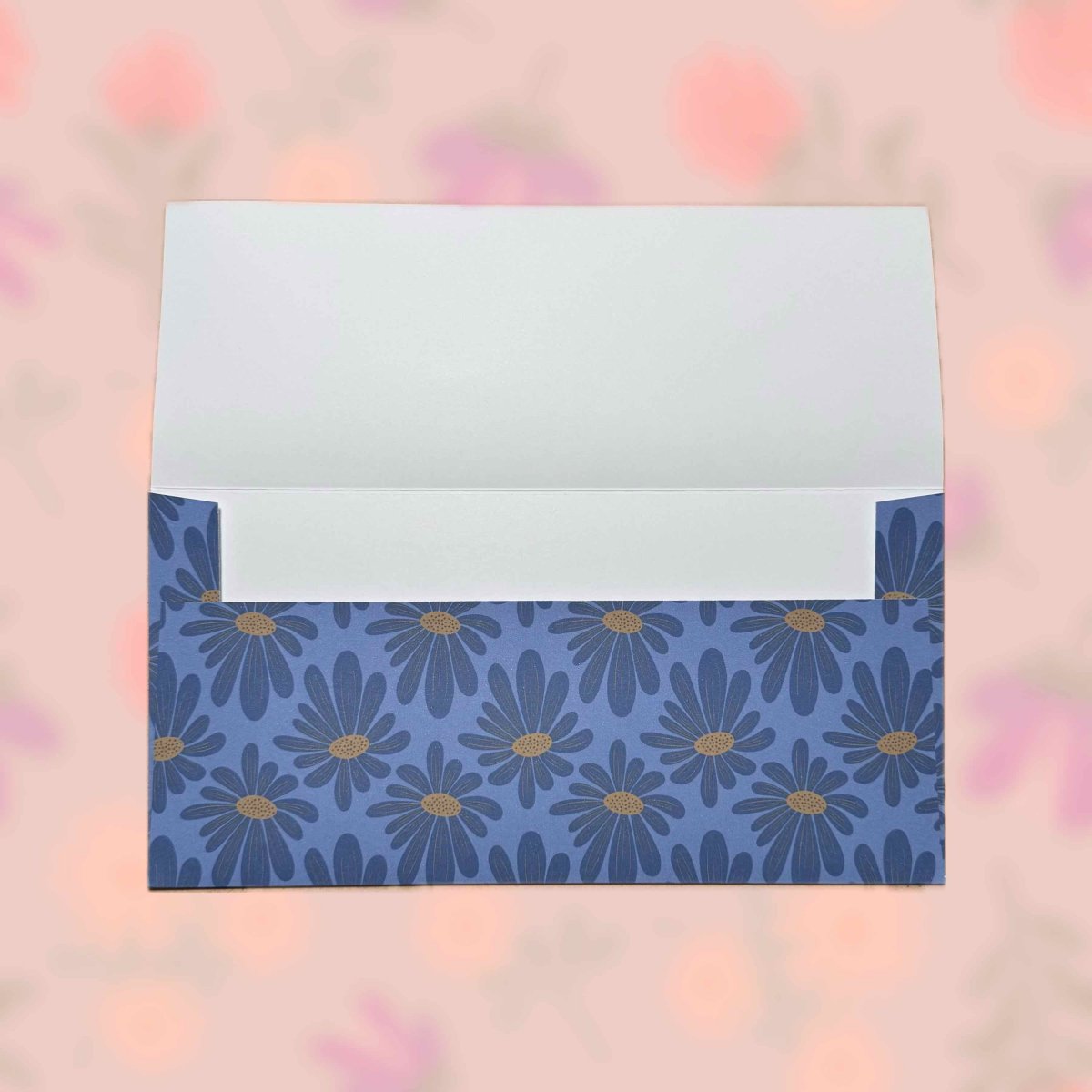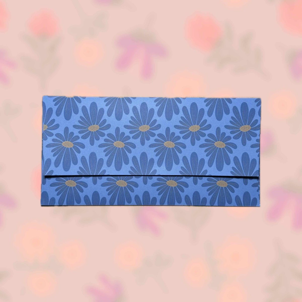 Papírová darovací ručně skládaná obálka s potiskem autorskou grafikou - abstraktní modré květy se žlutým žilkováním na modrém pozadí. Obálka z bílého papíru gramáže 160 g/m2 s inkoustovým potiskem.