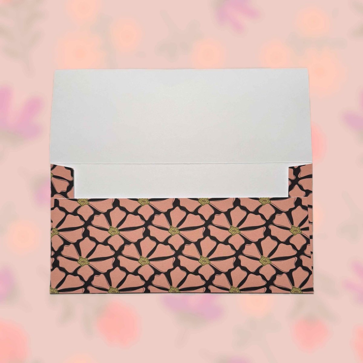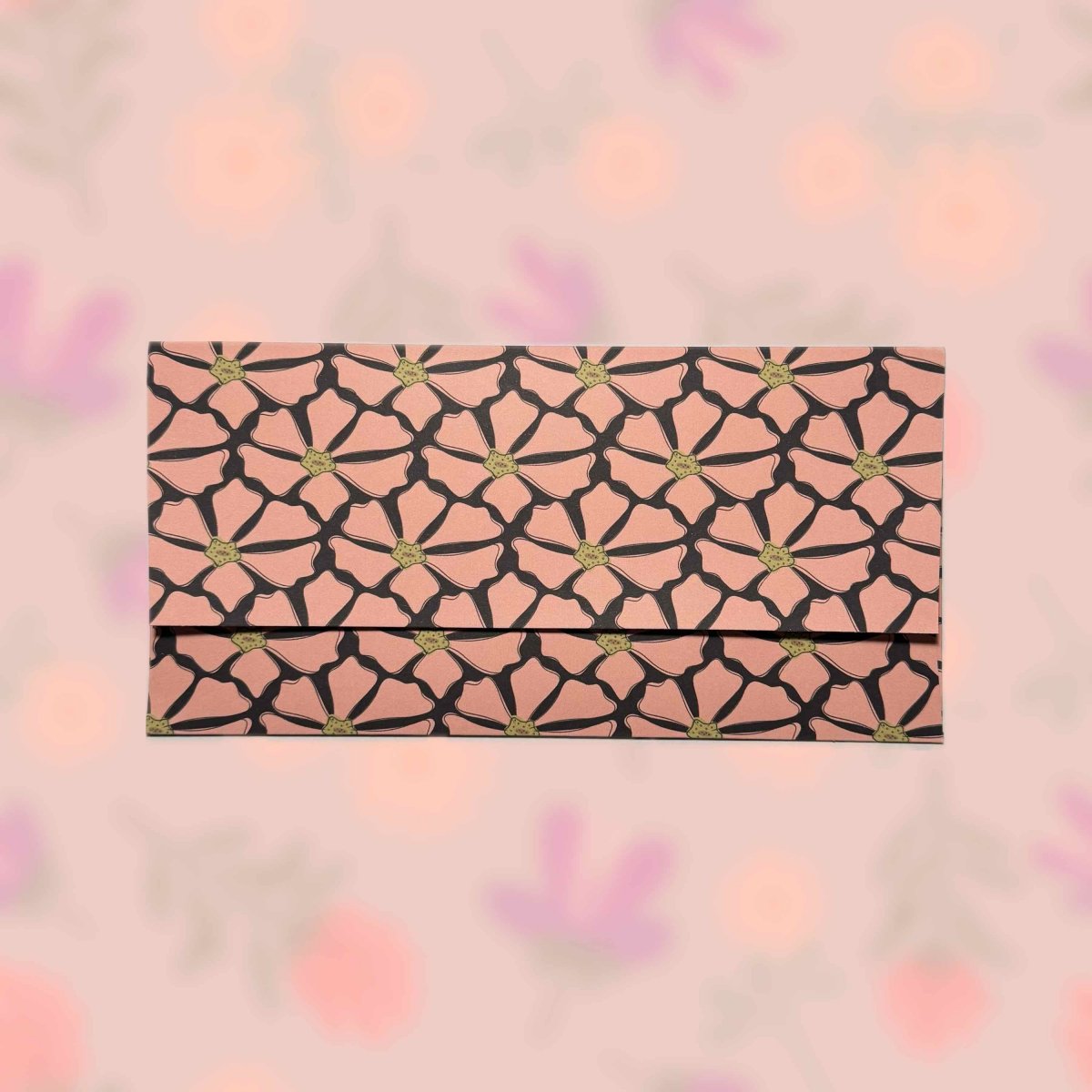 Papírová darovací ručně skládaná obálka s potiskem autorskou grafikou - abstraktní květy meruňkové barvy na černém pozadí. Obálka z bílého papíru gramáže 160 g/m2 s inkoustovým potiskem.