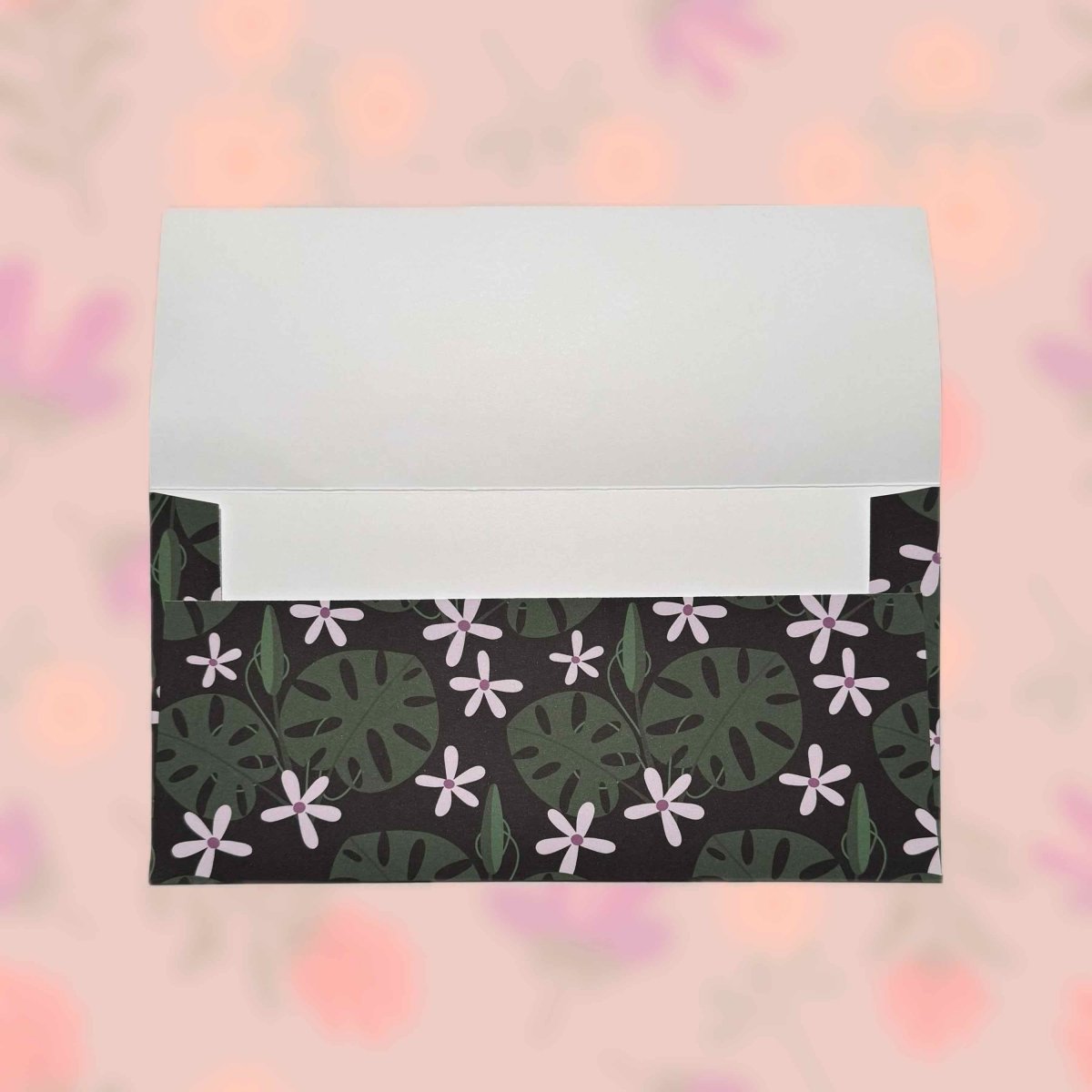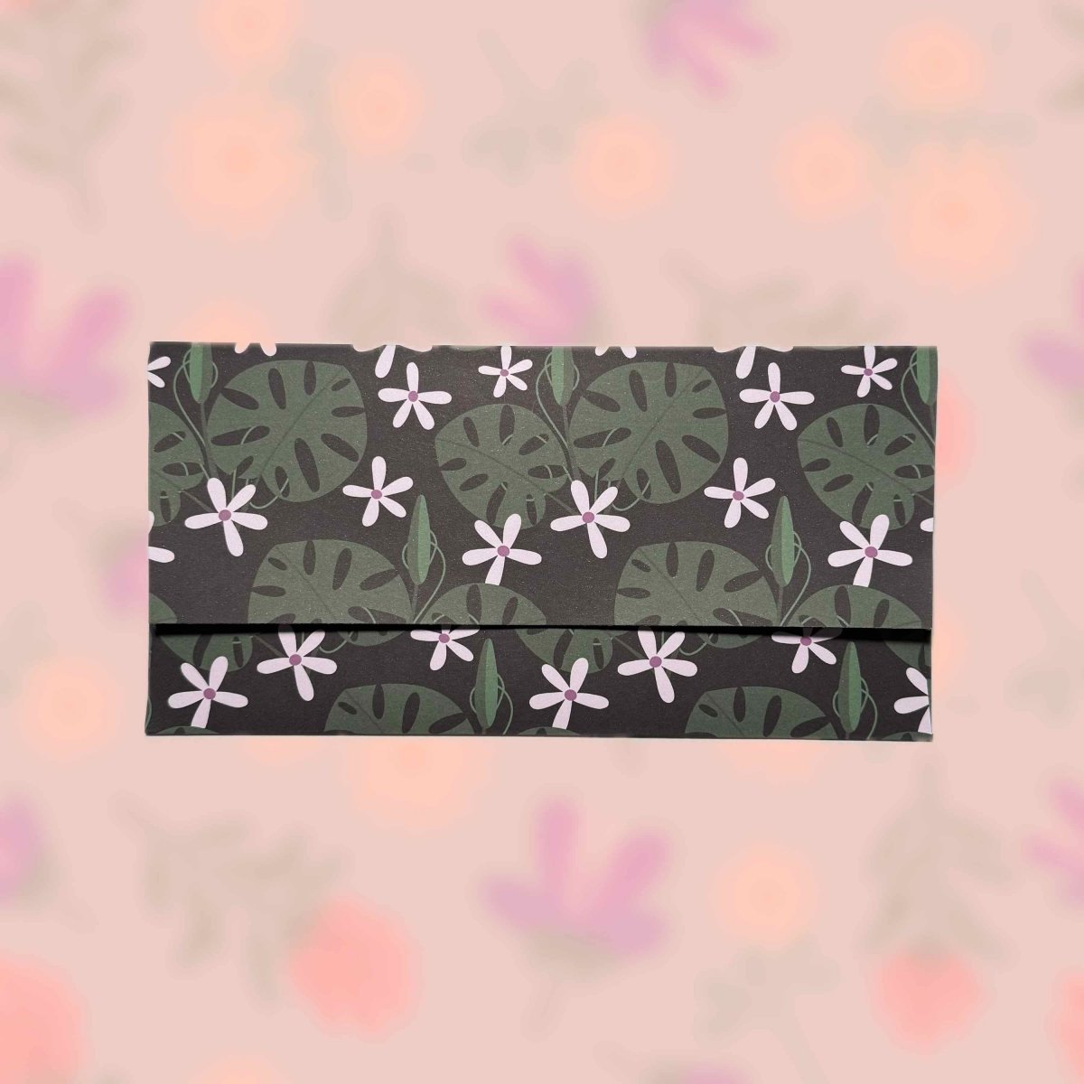 Papírová darovací ručně skládaná obálka s potiskem autorskou grafikou - velké listy monstery s abstraktními květy na černém pozadí. Obálka z bílého papíru gramáže 160 g/m2 s inkoustovým potiskem.