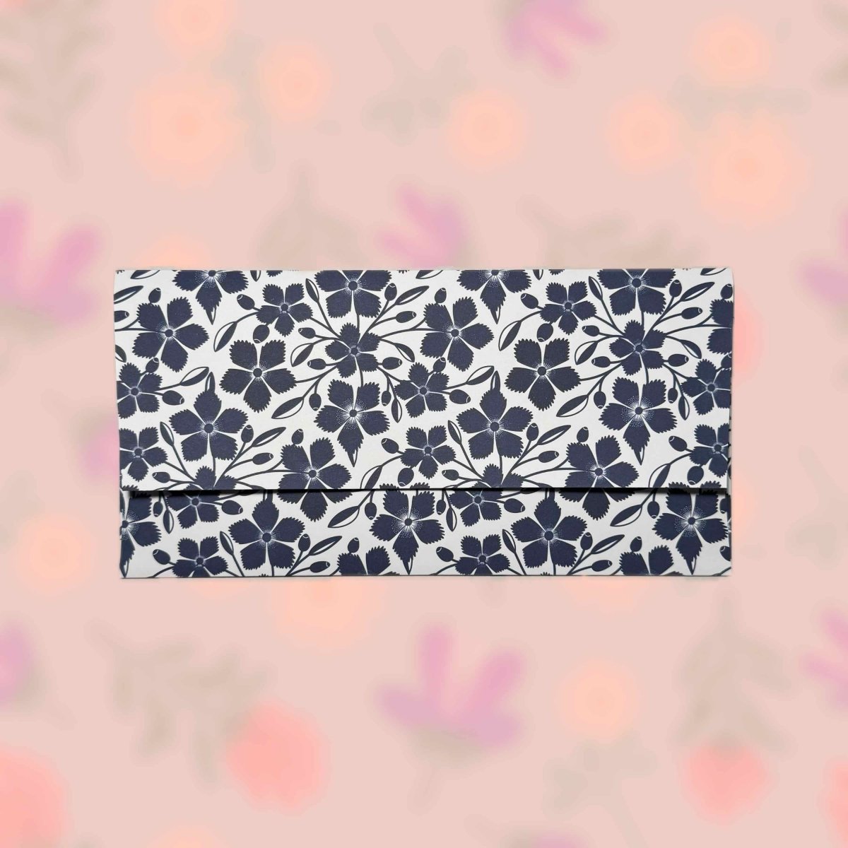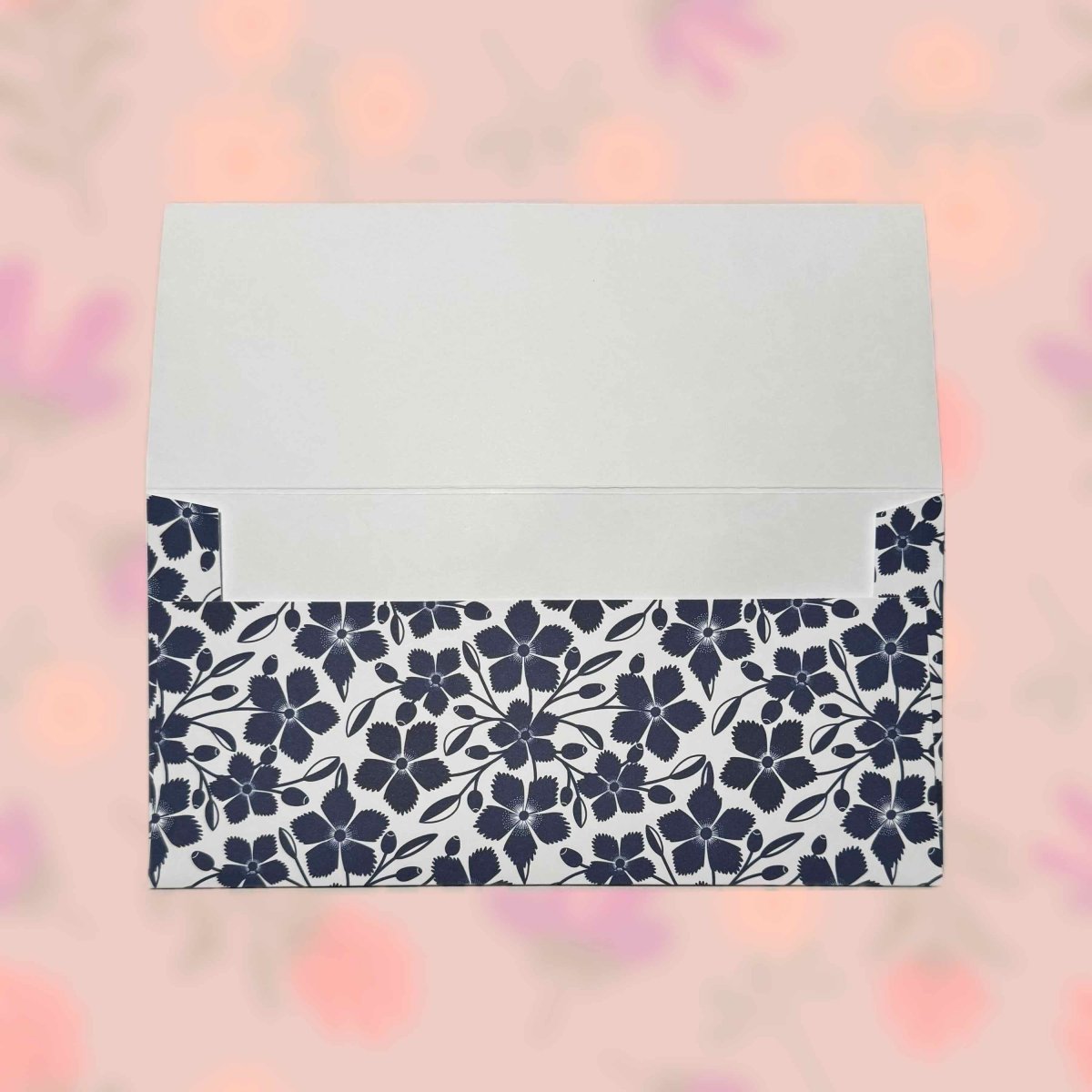 Papírová darovací ručně skládaná obálka s potiskem autorskou grafikou připomínající modrotisk - drobné kvítky s lístky na bílém pozadí. Obálka z bílého papíru gramáže 160 g/m2 s inkoustovým potiskem.