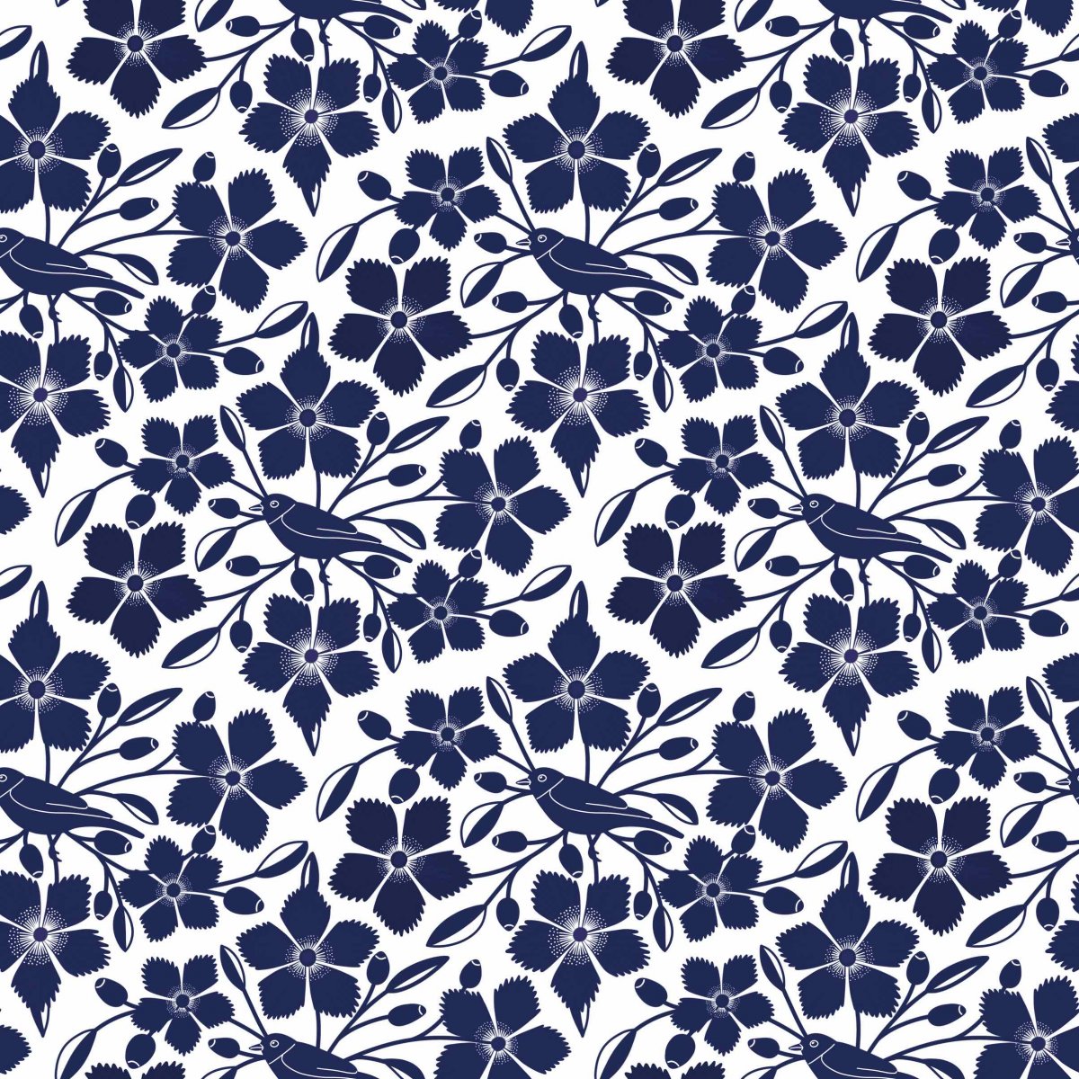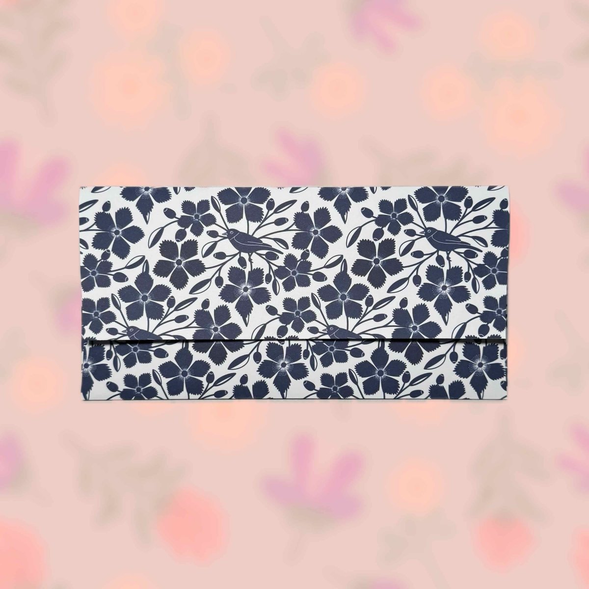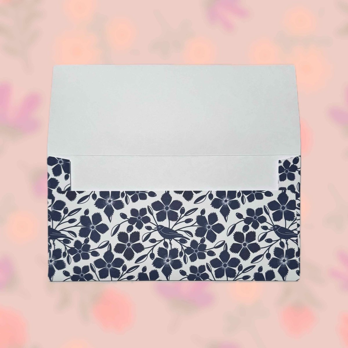 Papírová darovací ručně skládaná obálka s potiskem autorskou grafikou připomínající modrotisk - růžice drobných kvítků s lístky - uvnitř růžice květů sedí ptáček - bílé pozadí. Obálka z bílého papíru gramáže 160 g/m2 s inkoustovým potiskem.