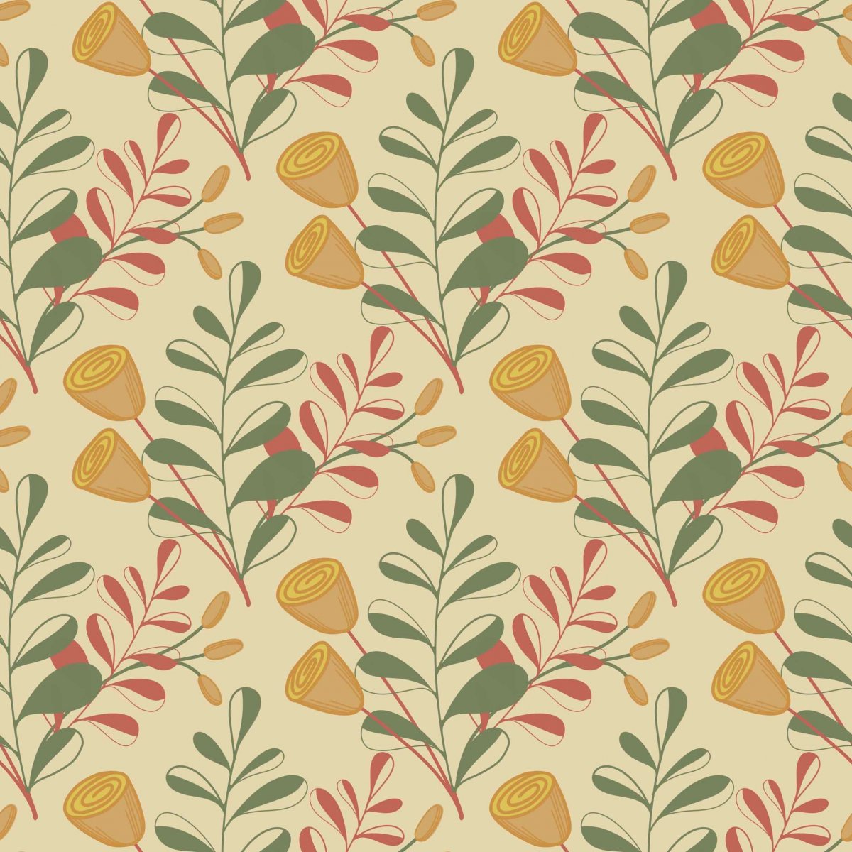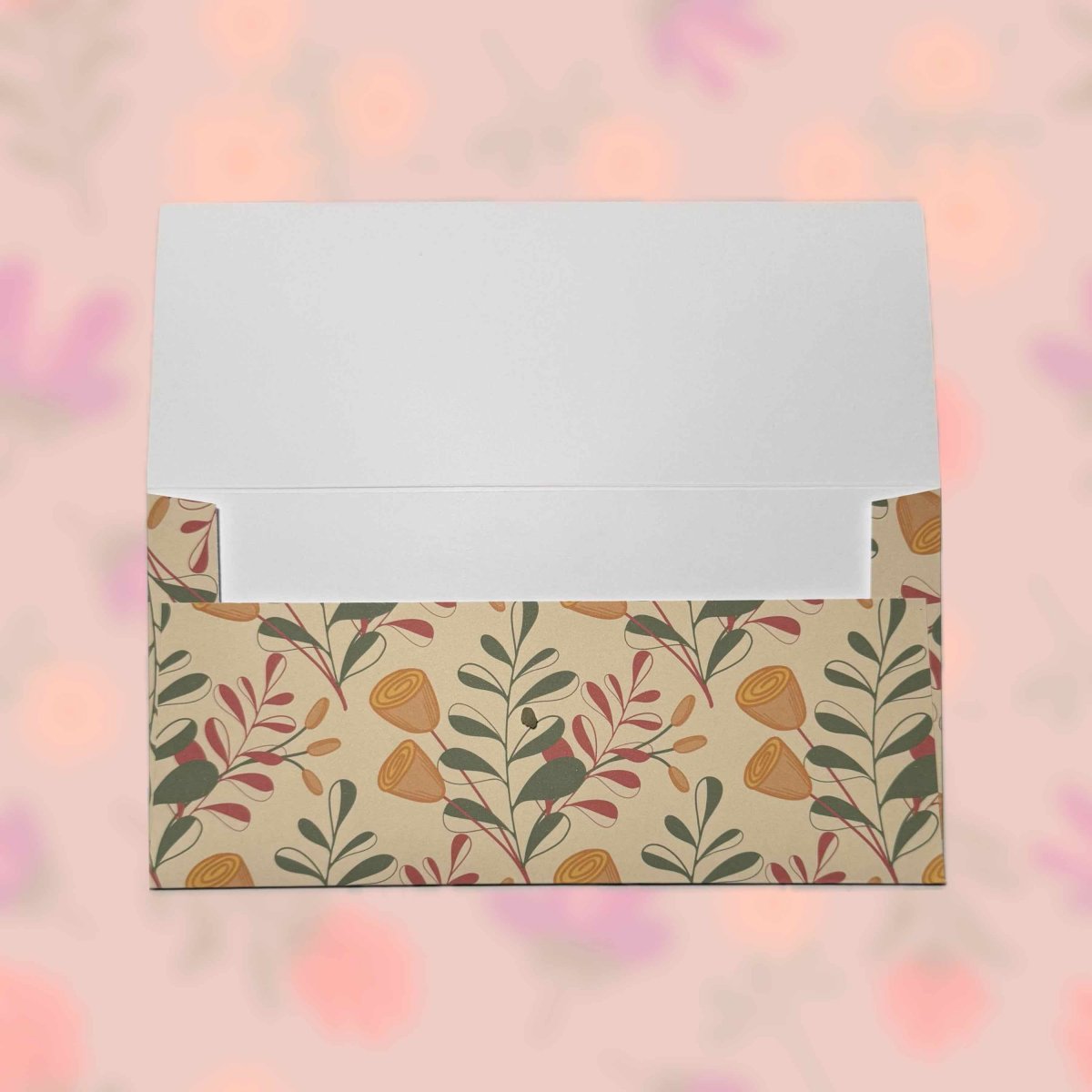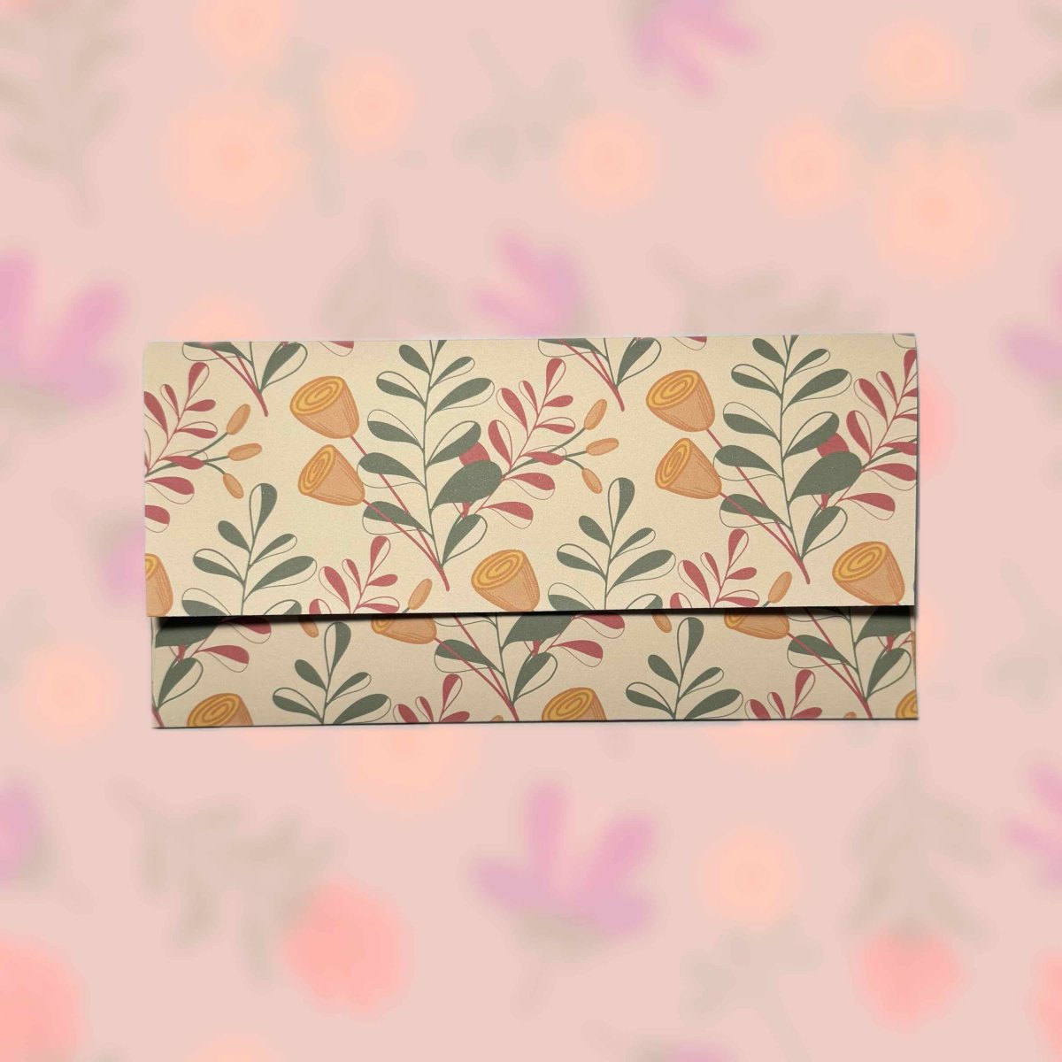 Papírová darovací ručně skládaná obálka s potiskem autorskou grafikou - větvička abstraktních květů a listů na světle žlutém pozadí. Obálka z bílého papíru gramáže 160 g/m2 s inkoustovým potiskem.