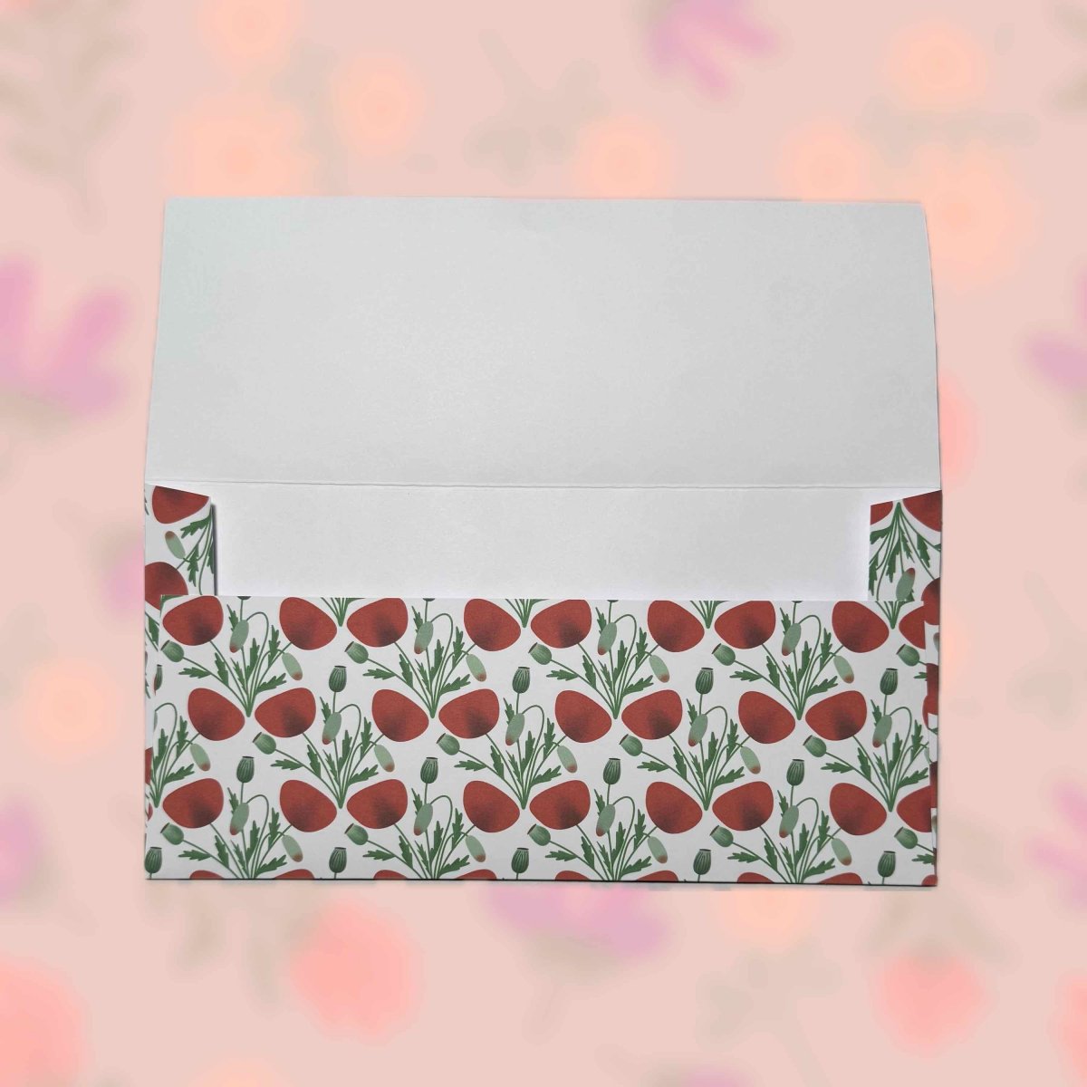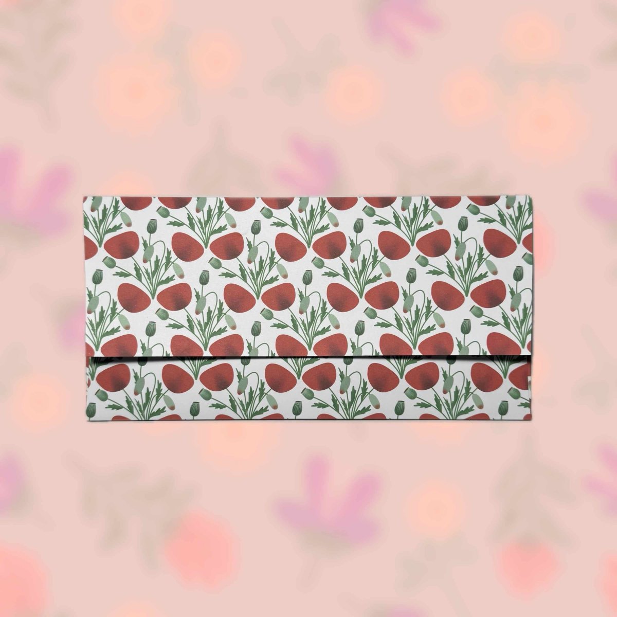 Papírová darovací ručně skládaná obálka s potiskem autorskou grafikou - vlčí máky s poupaty a makovicemi na bílém pozadí. Obálka z bílého papíru gramáže 160 g/m2 s inkoustovým potiskem.