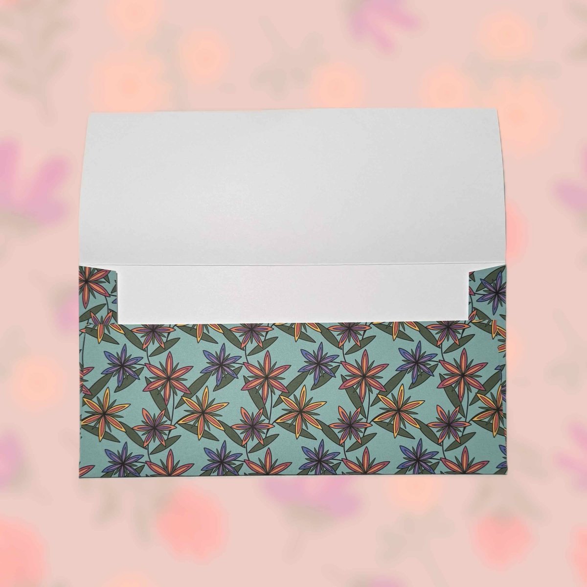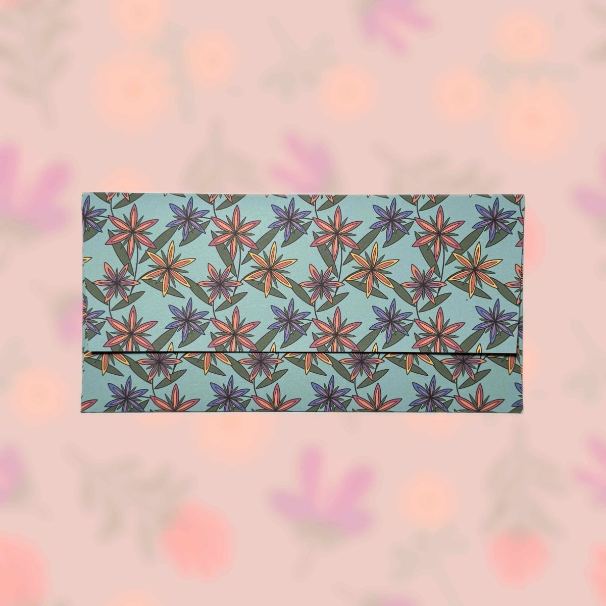 Papírová darovací ručně skládaná obálka s potiskem autorskou grafikou - abstraktní barevné květy s listy na světle tyrkysovém pozadí. Obálka z bílého papíru gramáže 160 g/m2 s inkoustovým potiskem.