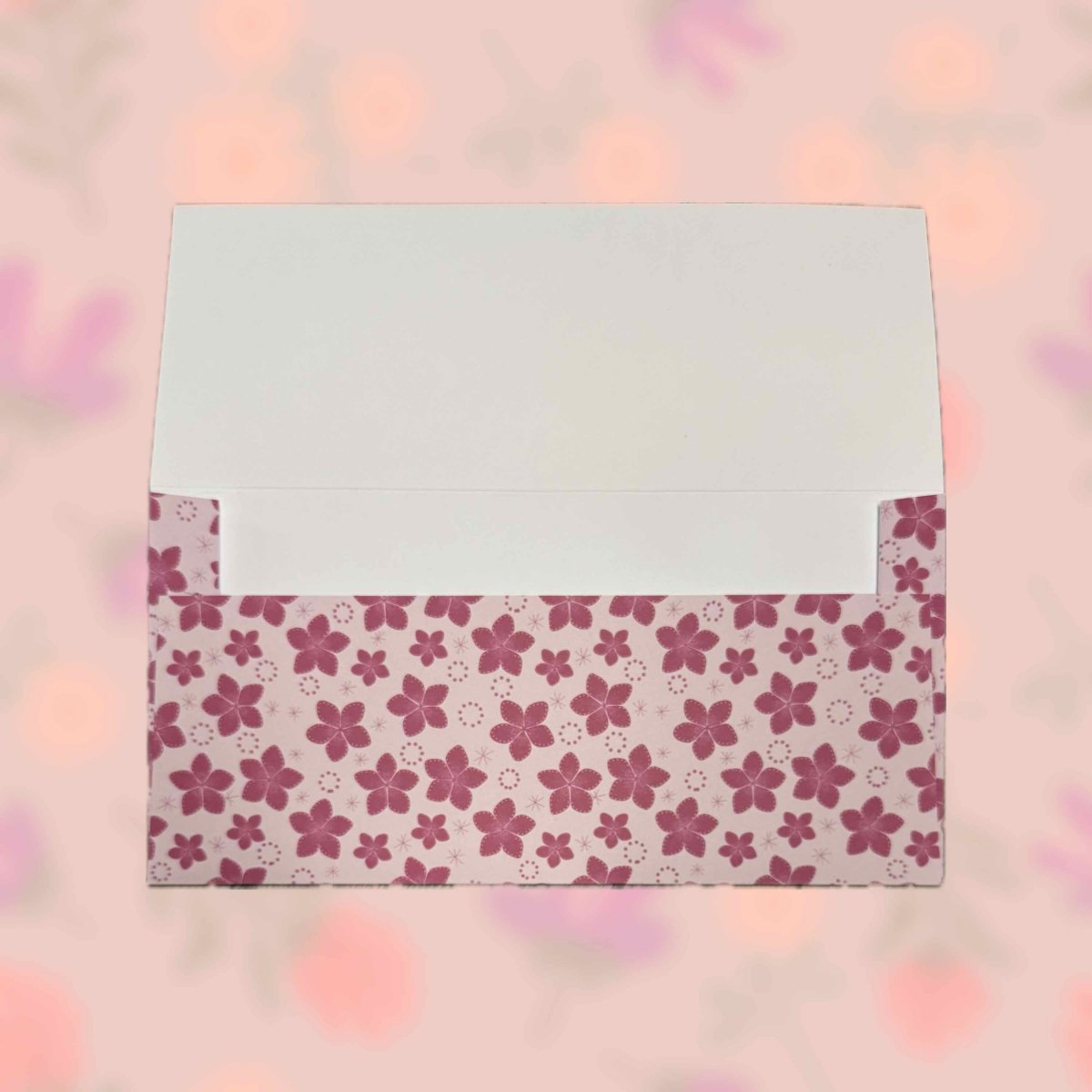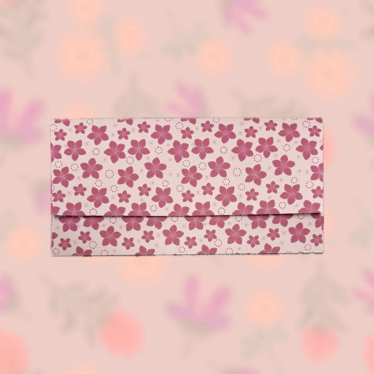 Papírová darovací ručně skládaná obálka s potiskem autorskou grafikou - drobné sytě růžové květy na světle růžovém pozadí. Obálka z bílého papíru gramáže 160 g/m2 s inkoustovým potiskem.