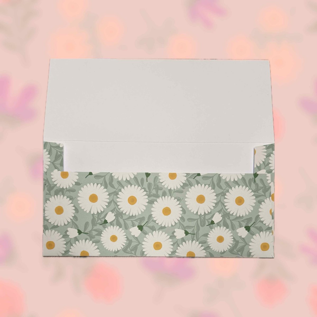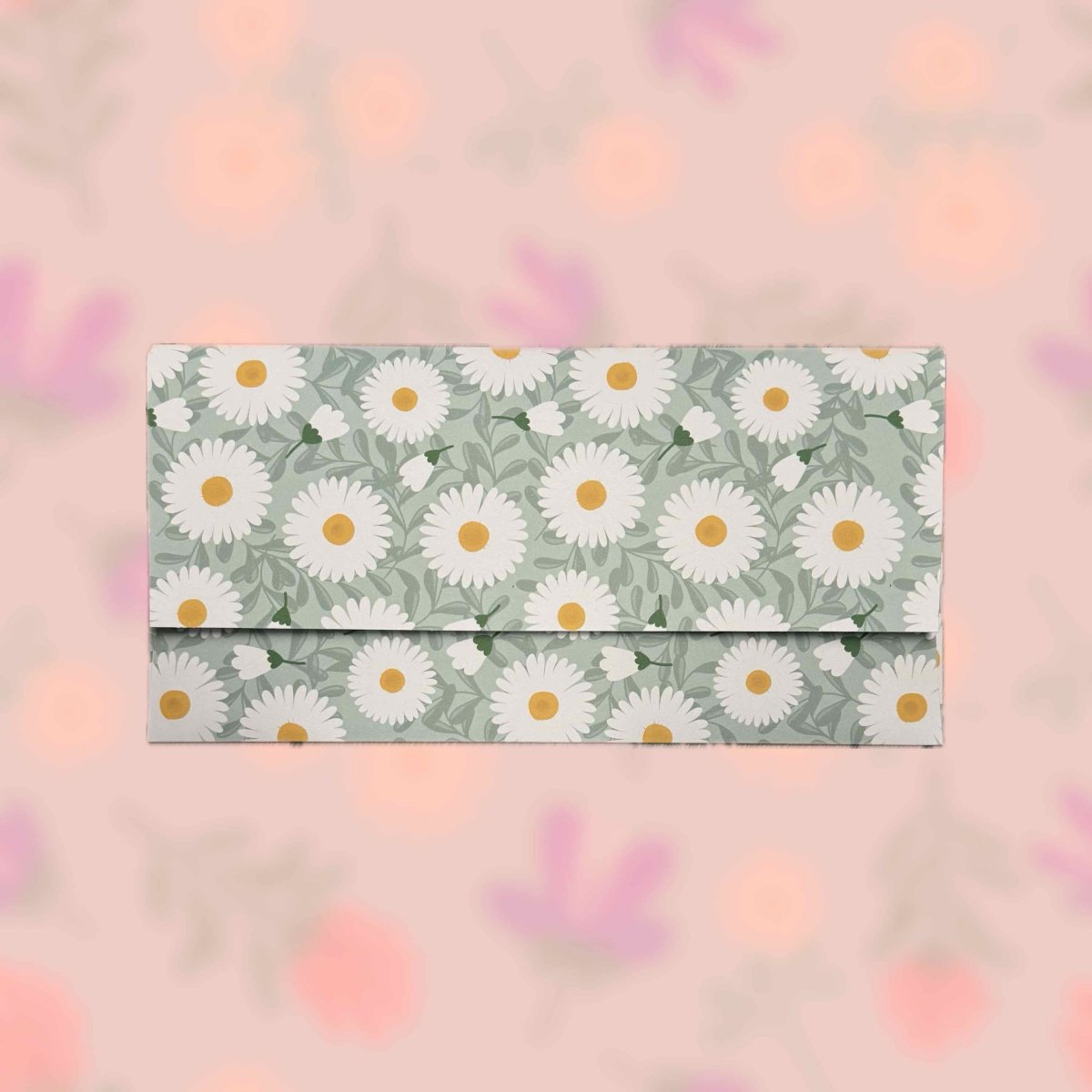 Papírová darovací ručně skládaná obálka s potiskem autorskou grafikou - bílé kopretiny s poupaty a listy na světle šedo-zeleném pozadí. Obálka z bílého papíru gramáže 160 g/m2 s inkoustovým potiskem.