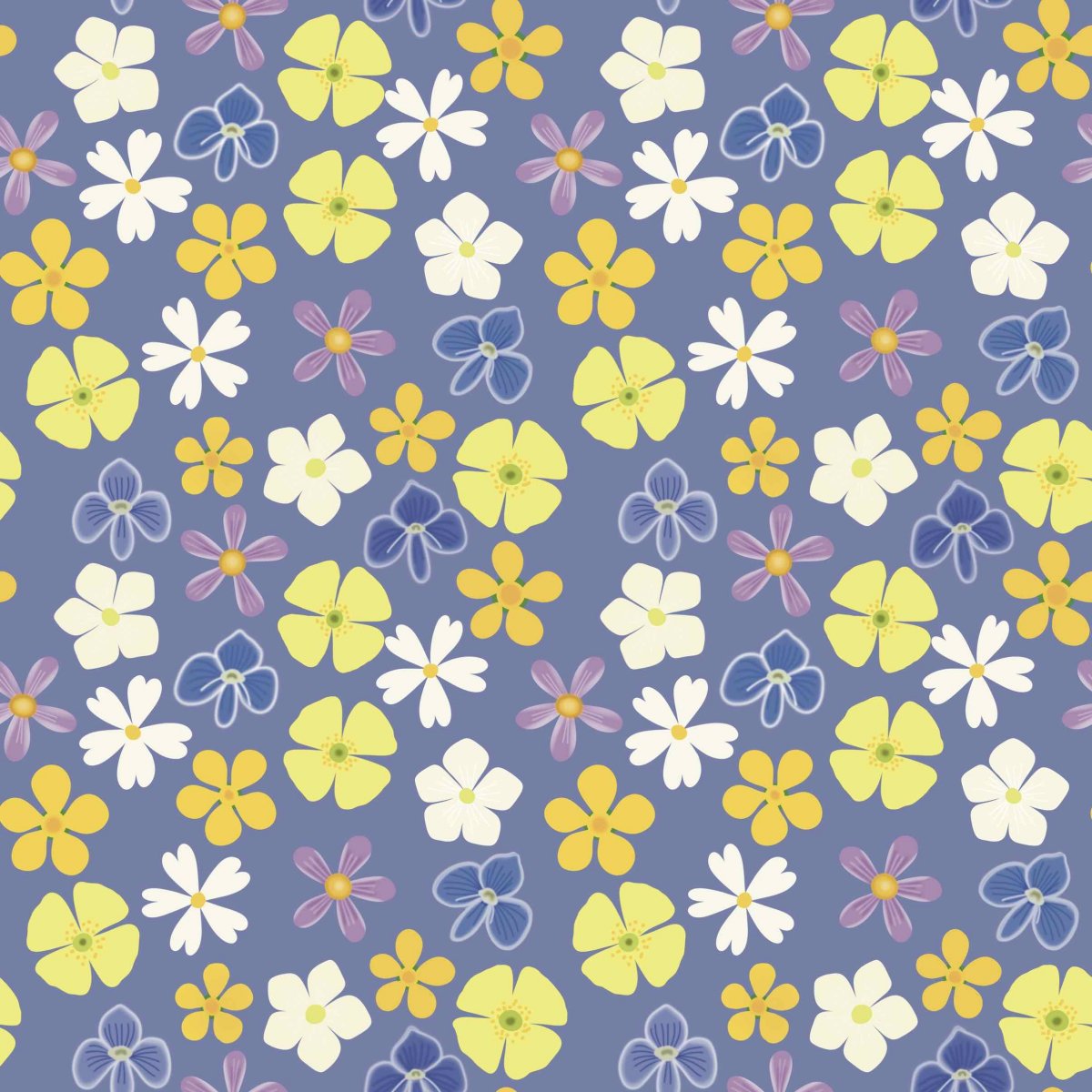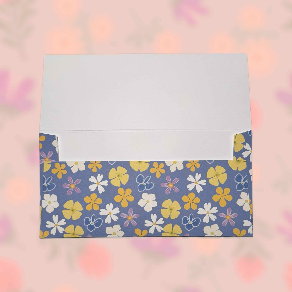 Papírová darovací ručně skládaná obálka s potiskem autorskou grafikou - různá drobná rolní kvítka na šedo-modrém pozadí. Obálka z bílého papíru gramáže 160 g/m2 s inkoustovým potiskem.