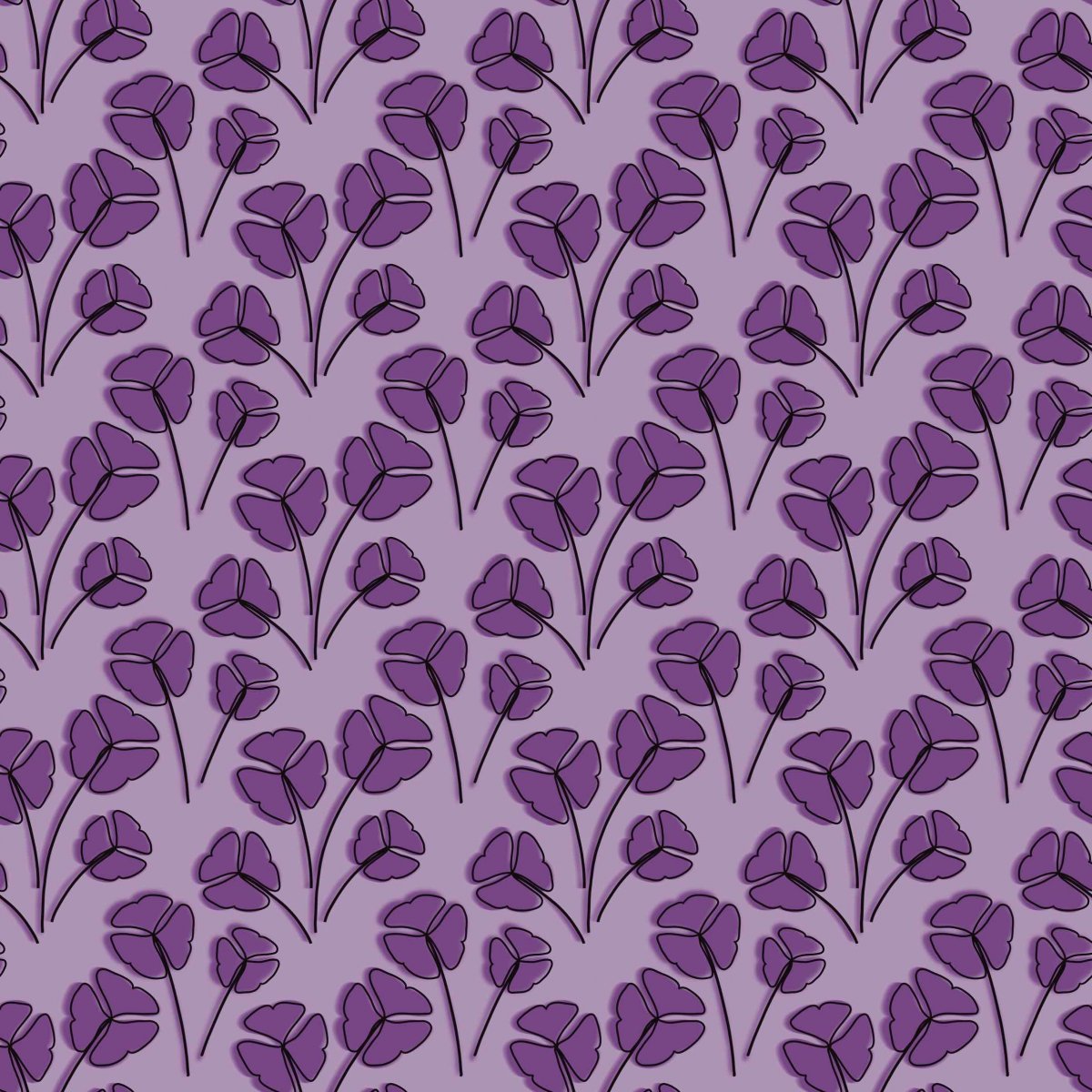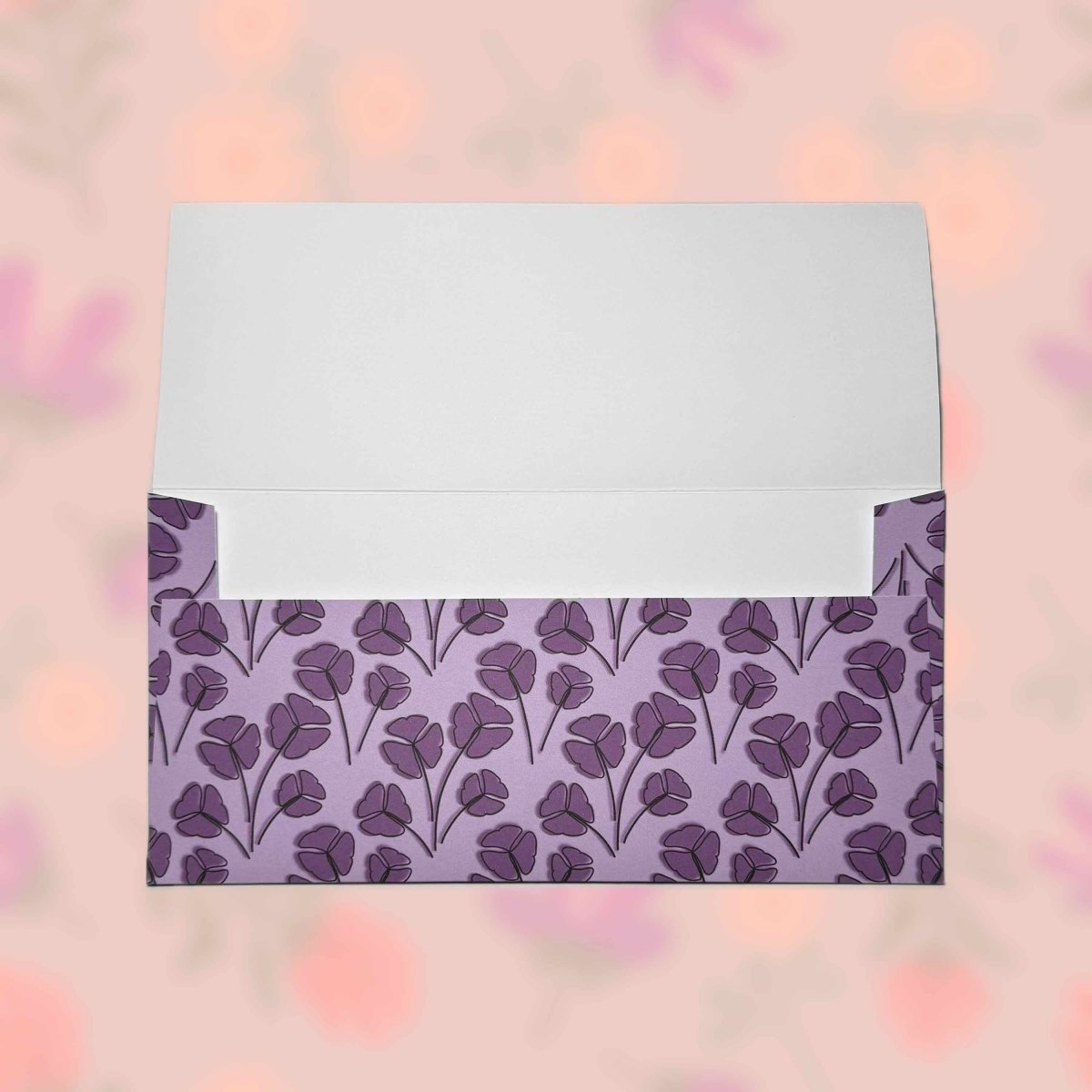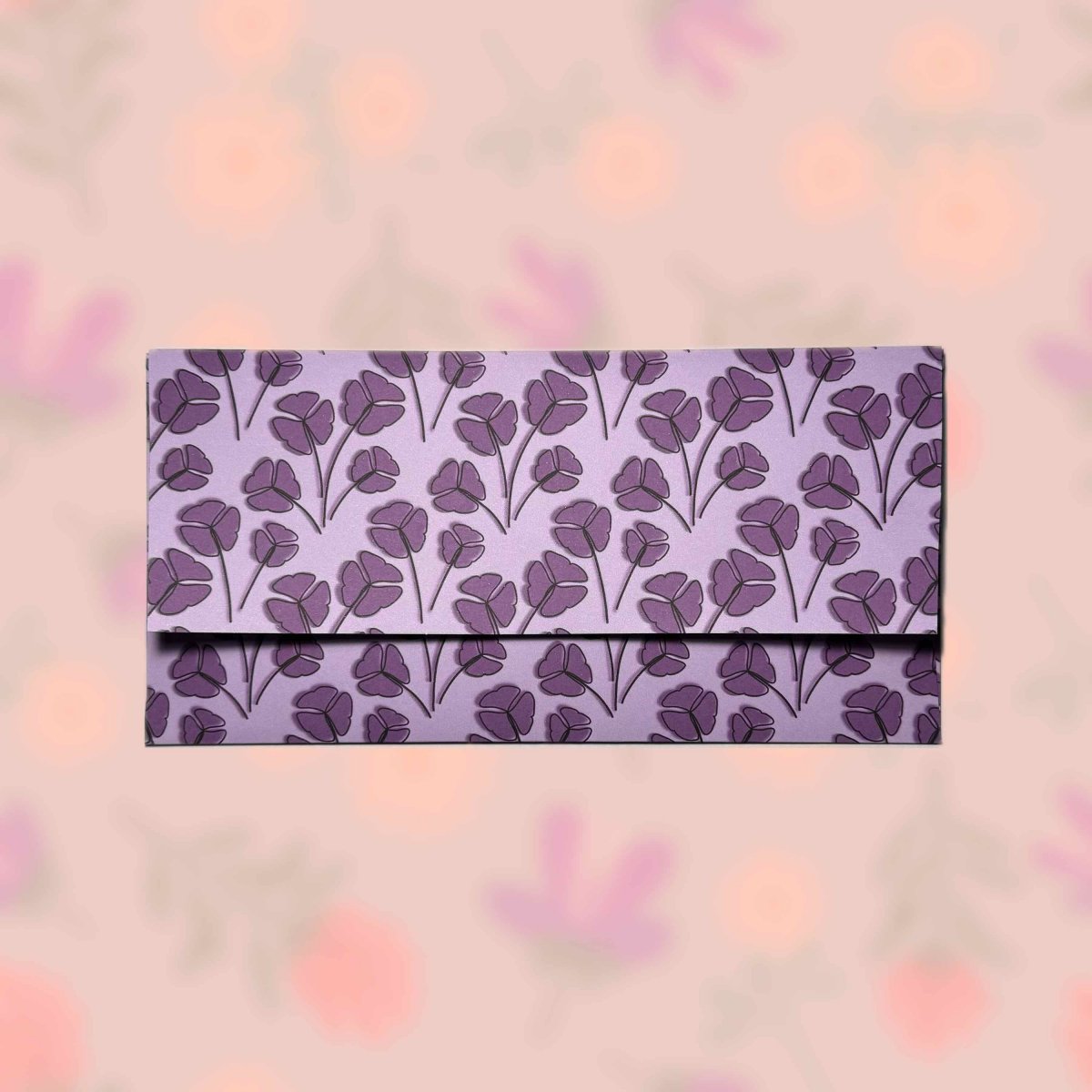 Papírová darovací ručně skládaná obálka s potiskem autorskou grafikou - fialové trojlístky pokojové rostliny na světle fialovém pozadí. Obálka z bílého papíru gramáže 160 g/m2 s inkoustovým potiskem.