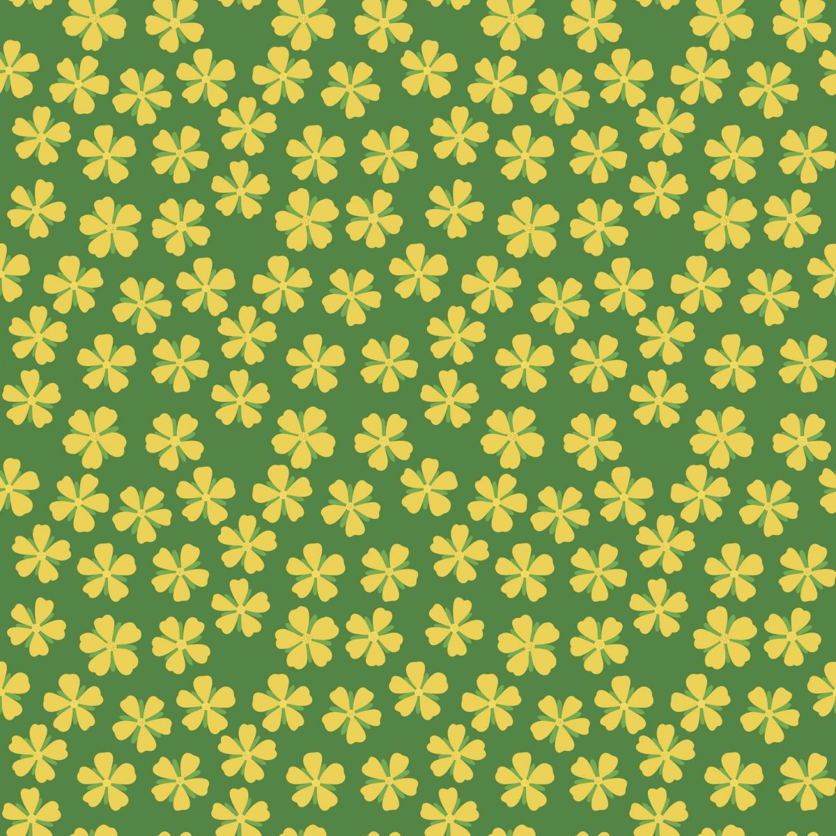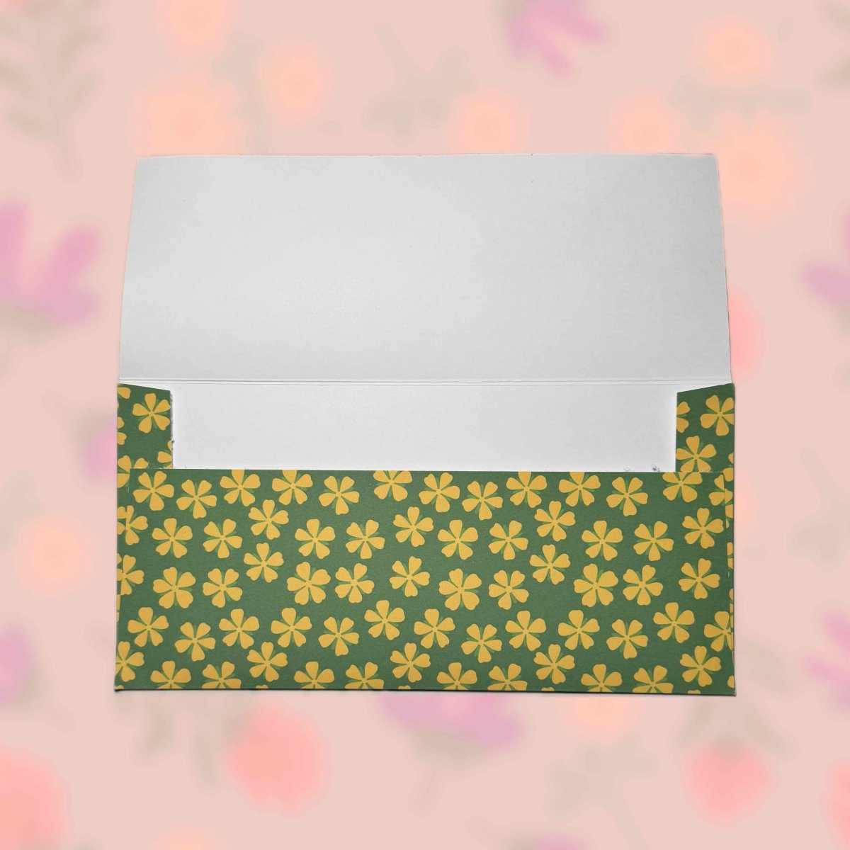 Papírová darovací ručně skládaná obálka s potiskem autorskou grafikou - drobné žluté květy a trávově zeleném pozadí.