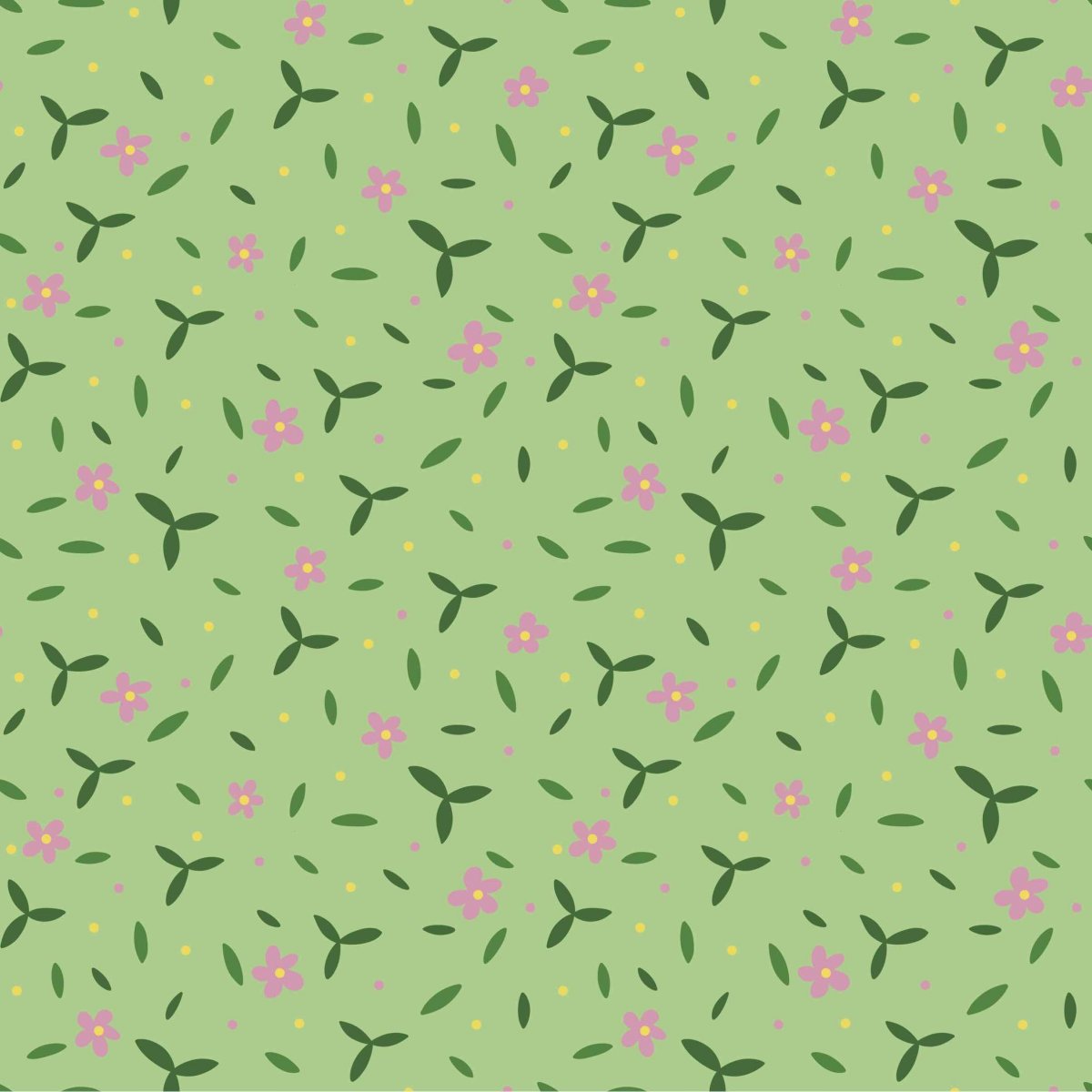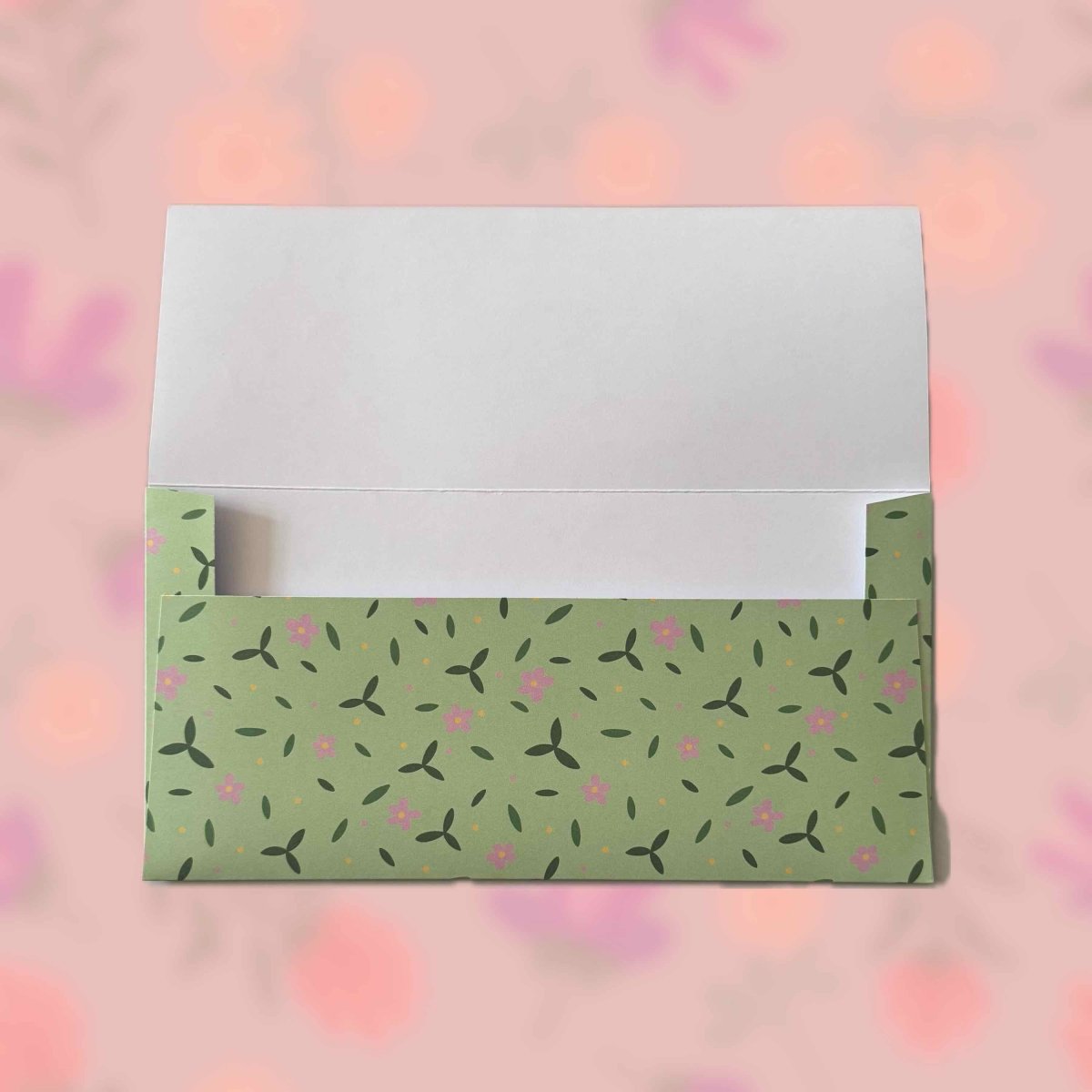 Papírová darovací ručně skládaná obálka s potiskem autorskou grafikou - abstraktní růžová kvítka s trojlístky na hráškově zeleném pozadí.