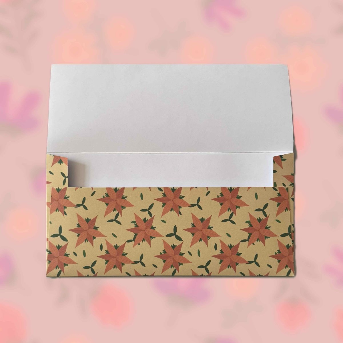 Papírová darovací ručně skládaná obálka s potiskem autorskou grafikou - abstraktní oranžové hvězdicové květy na žlutém pozadí.