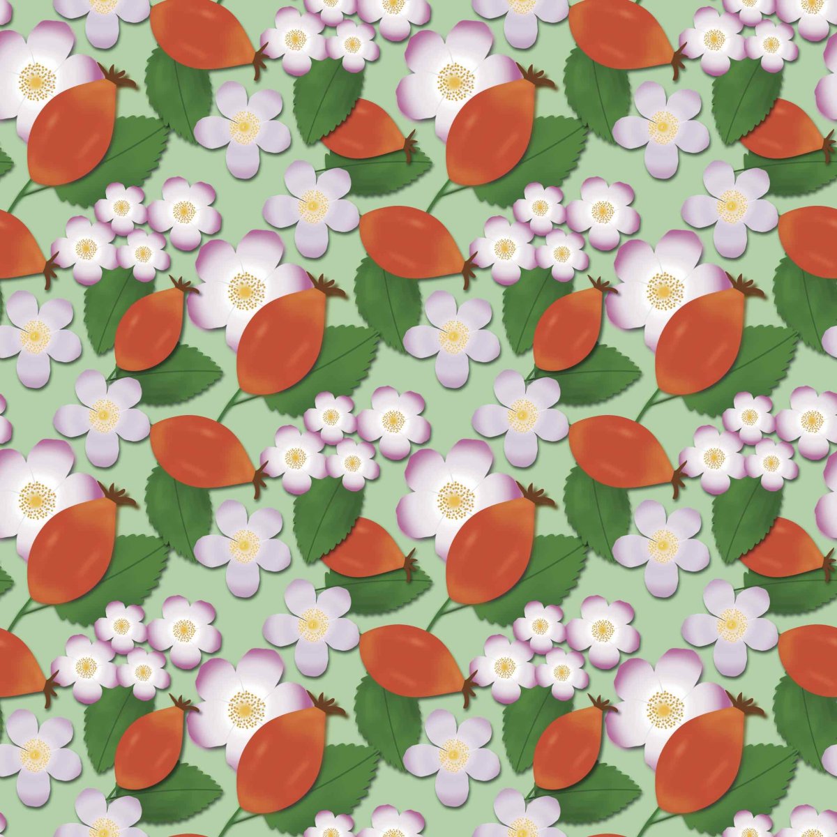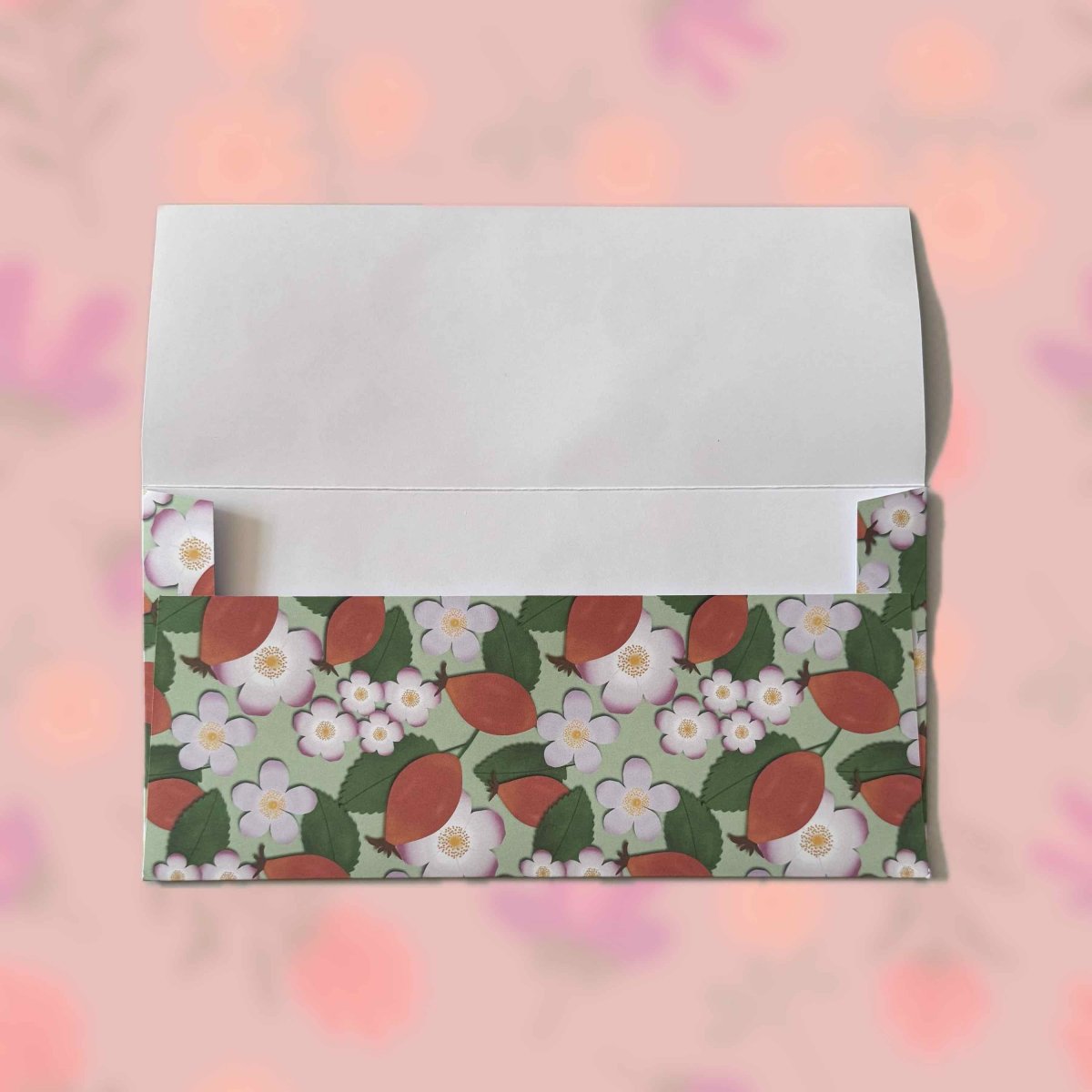 Papírová darovací ručně skládaná obálka s potiskem autorskou grafikou - jemné květy šípkové růže s listy a velkými plody na světle zeleném pozadí.