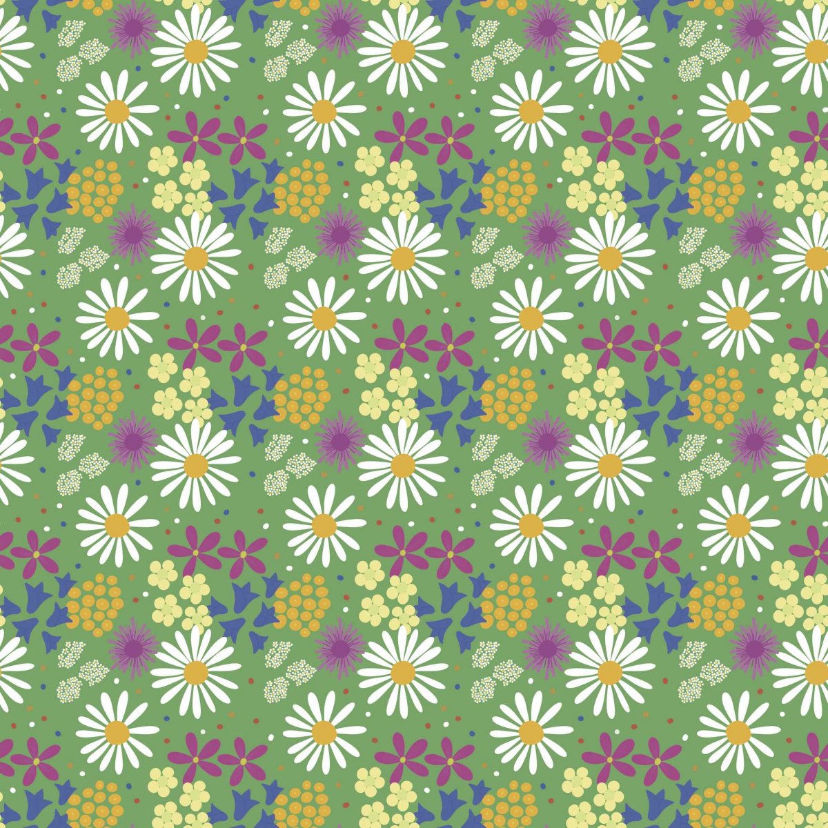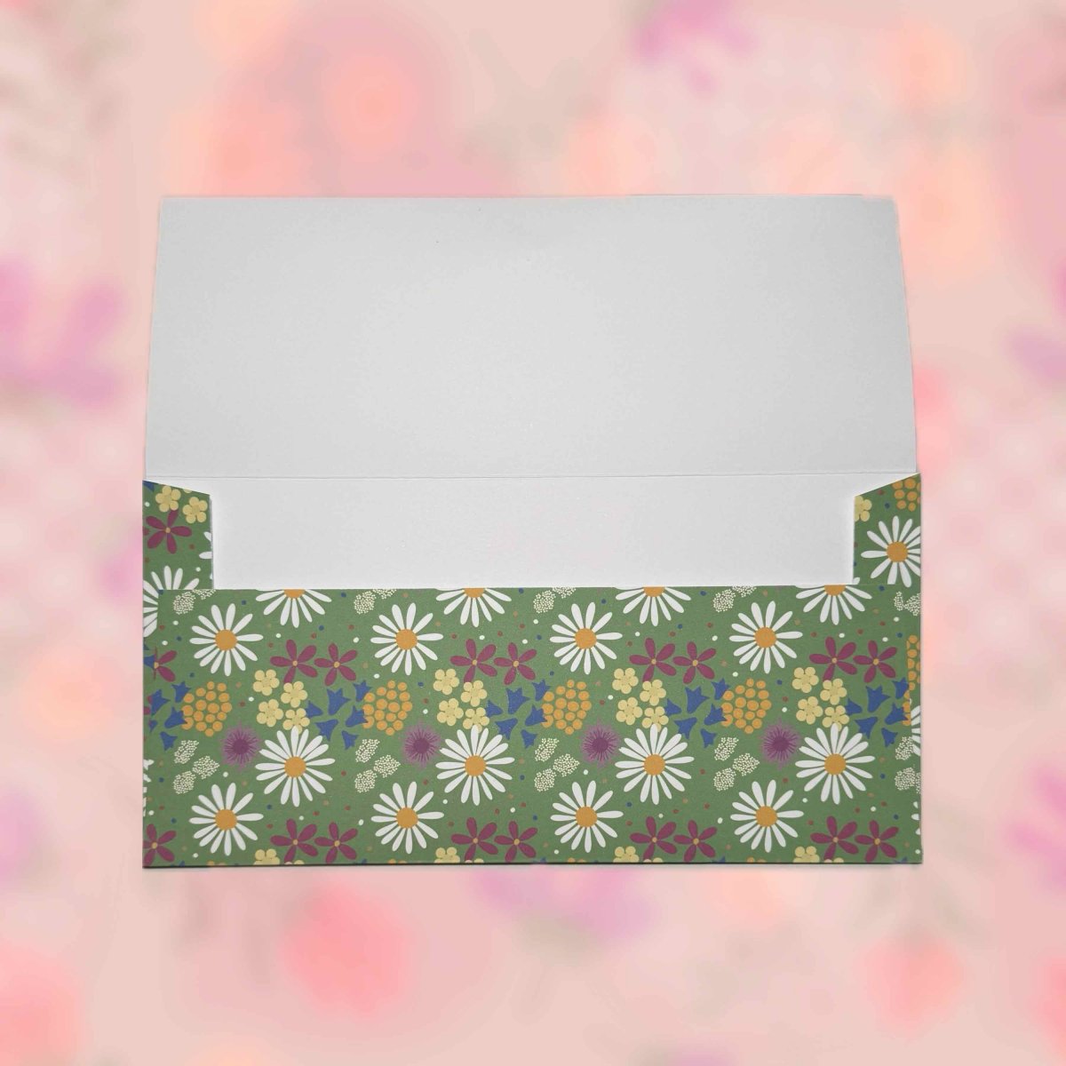 Papírová darovací ručně skládaná obálka s potiskem autorskou grafikou - směs různého plevelnatého polního kvítí na zeleném pozadí.