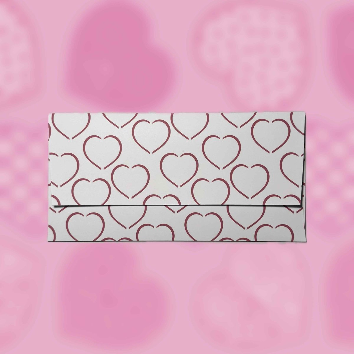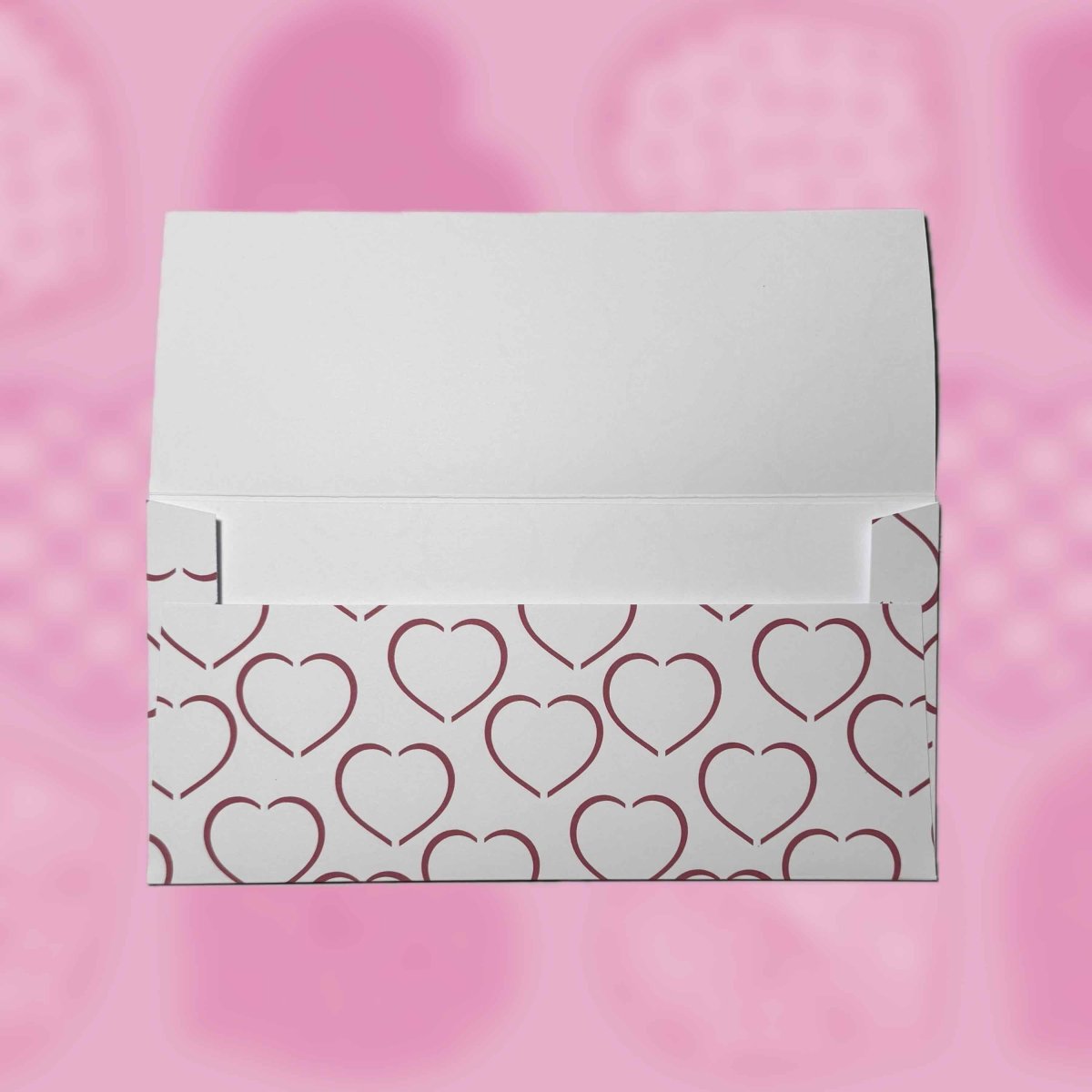 Papírová darovací ručně skládaná obálka s potiskem autorskou grafikou - abstraktní srdce kreslená červenou linkou na bílém pozadí. Obálka z bílého papíru gramáže 160 g/m2 s inkoustovým potiskem.