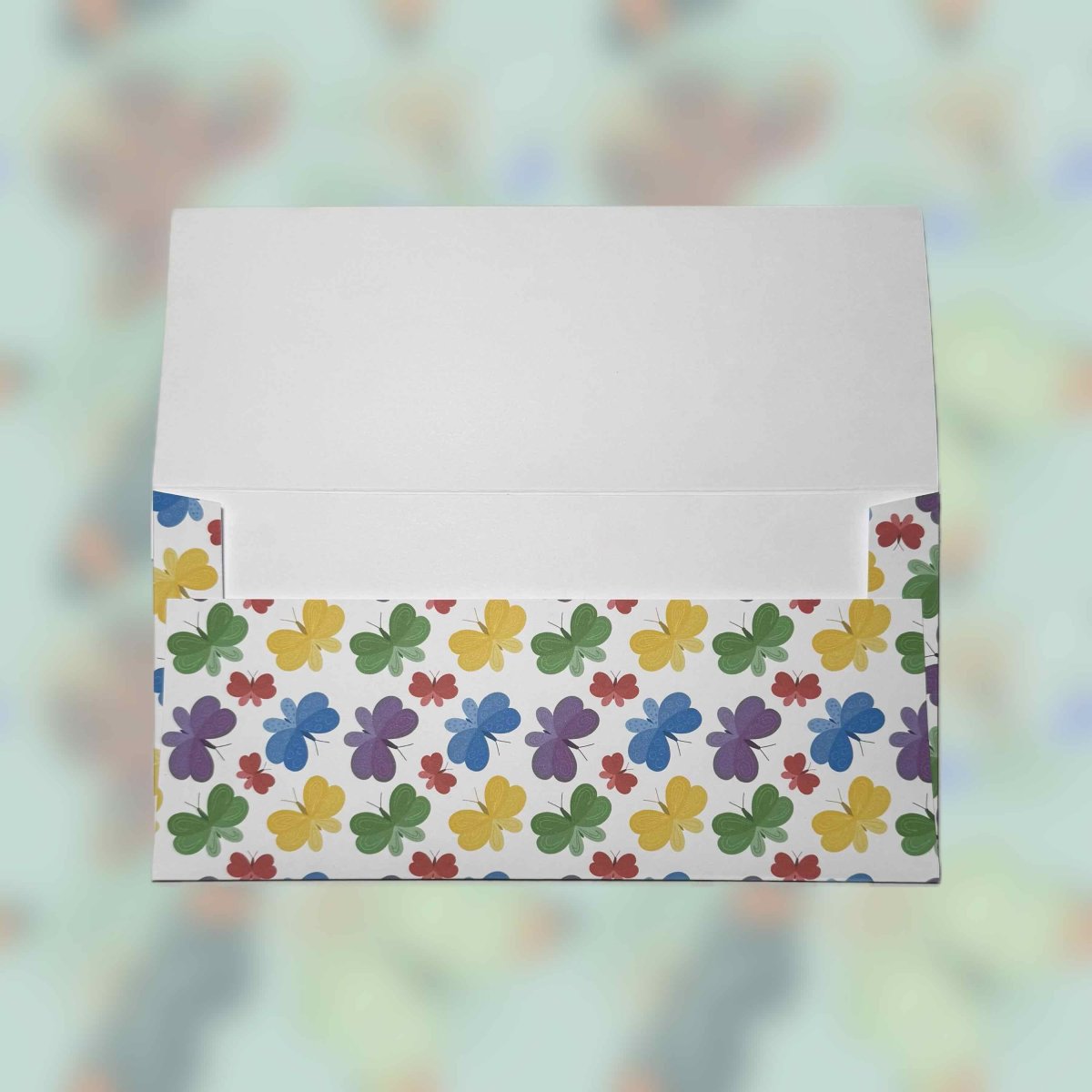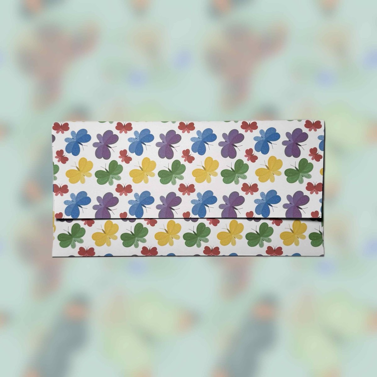 Papírová darovací ručně skládaná obálka s potiskem autorskou grafikou - barevní motýli na bílém pozadí. Obálka z bílého papíru gramáže 160 g/m2 s inkoustovým potiskem.