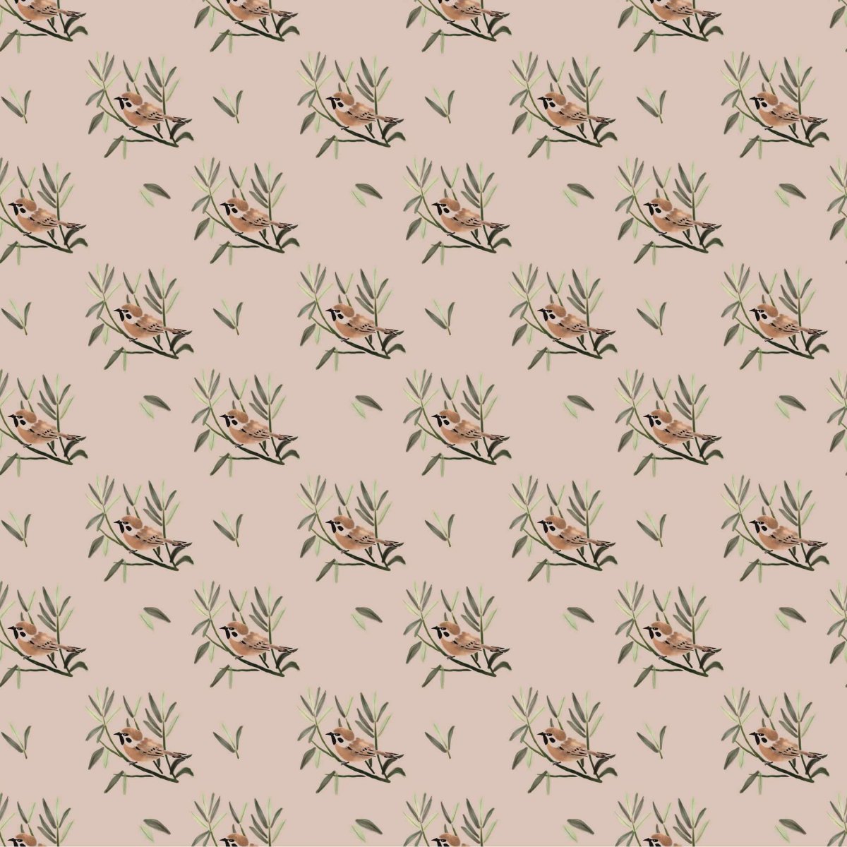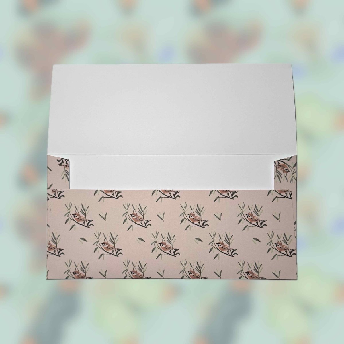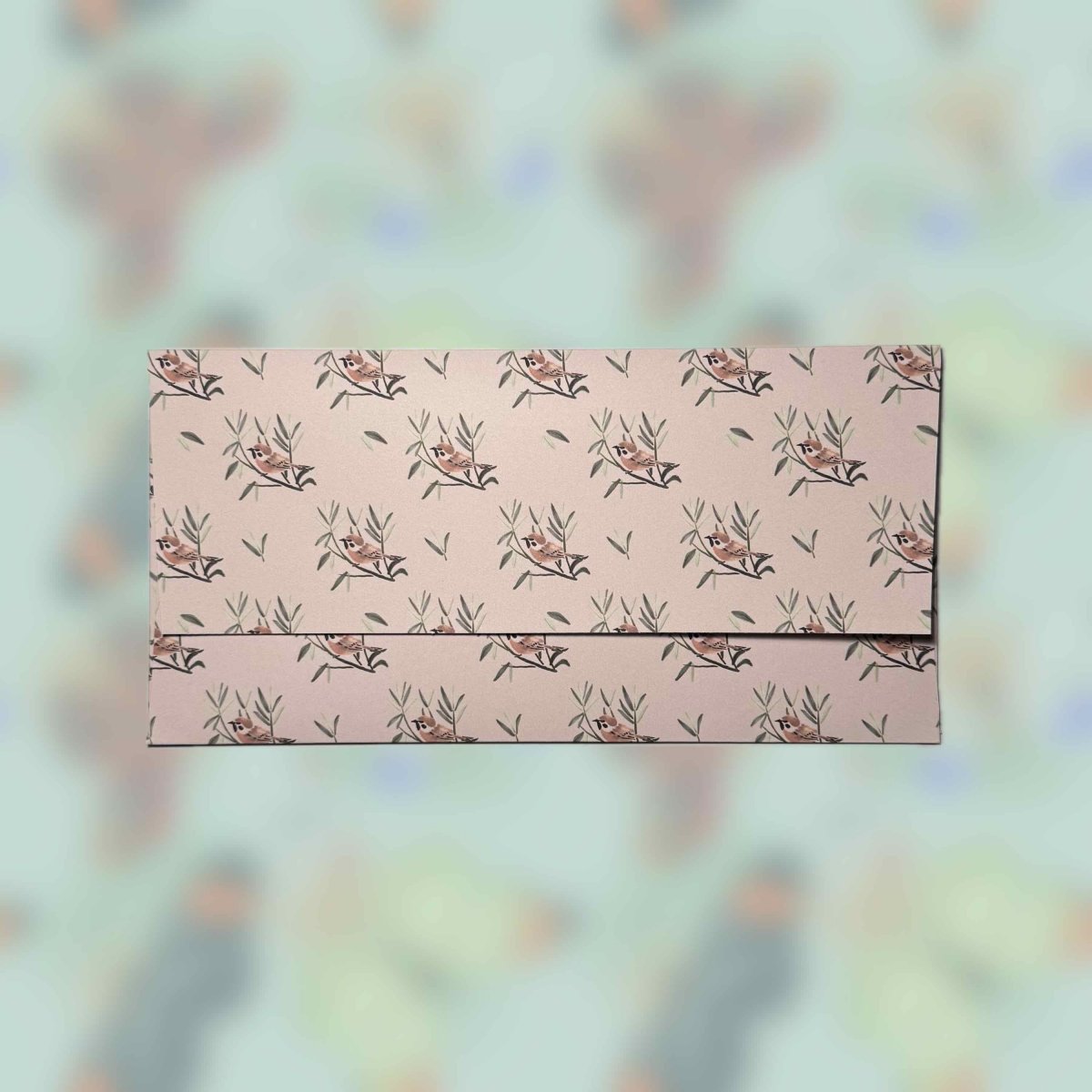 Papírová darovací ručně skládaná obálka s potiskem autorskou grafikou - ptáčci na větvičkách na béžovém pozadí. Obálka z bílého papíru gramáže 160 g/m2 s inkoustovým potiskem.