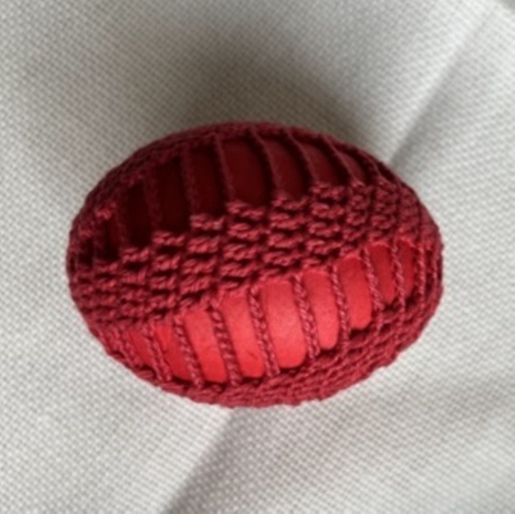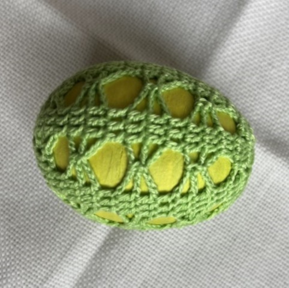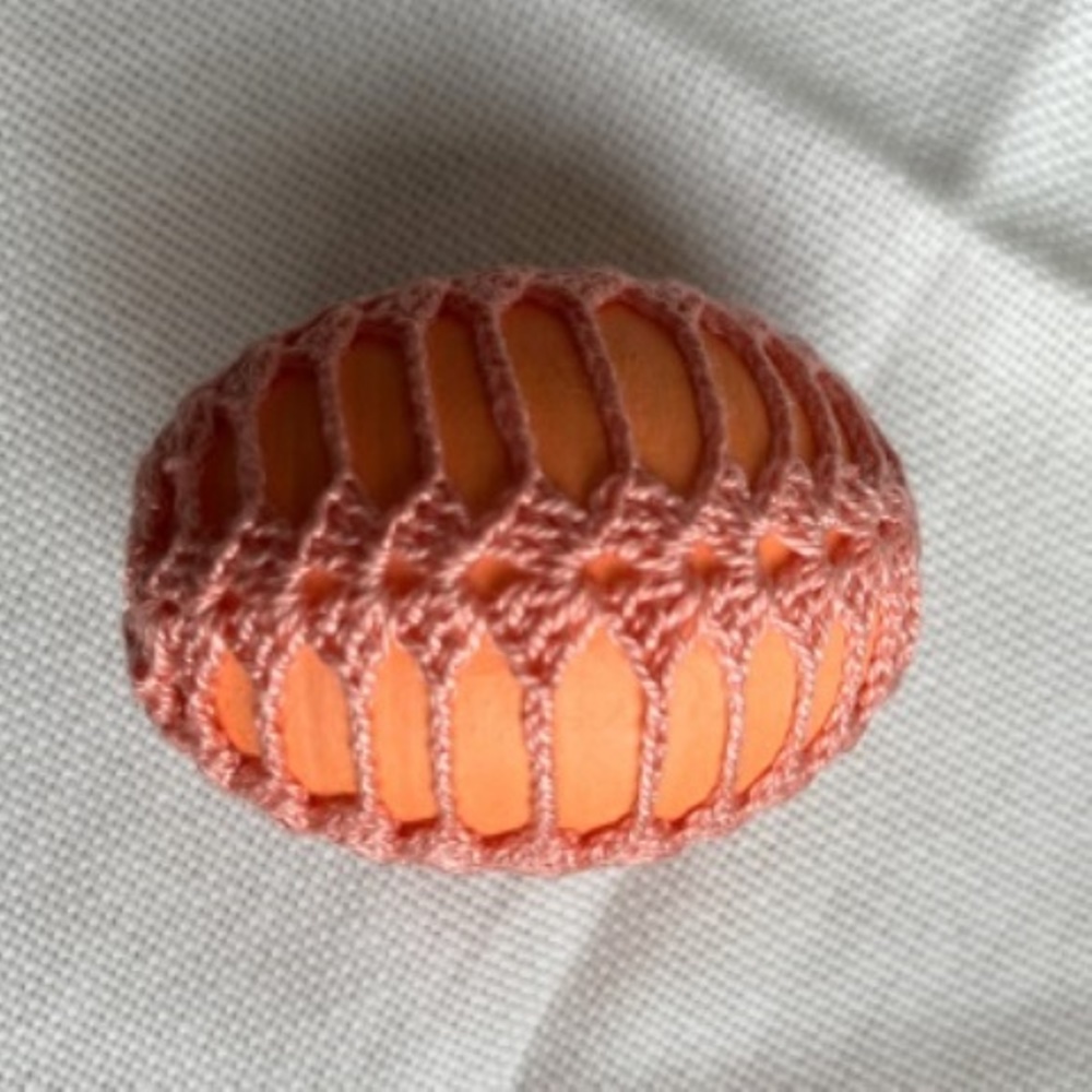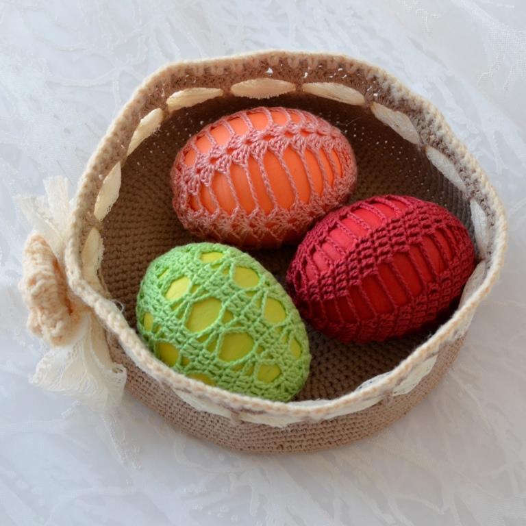 Krajková háčkovaná vajíčka - bavlněná příze na barevném vatovém vajíčku. Velikost 6,5 cm. Sadu tvoří 3 ks - červené, oranžové a zelené vajíčko.