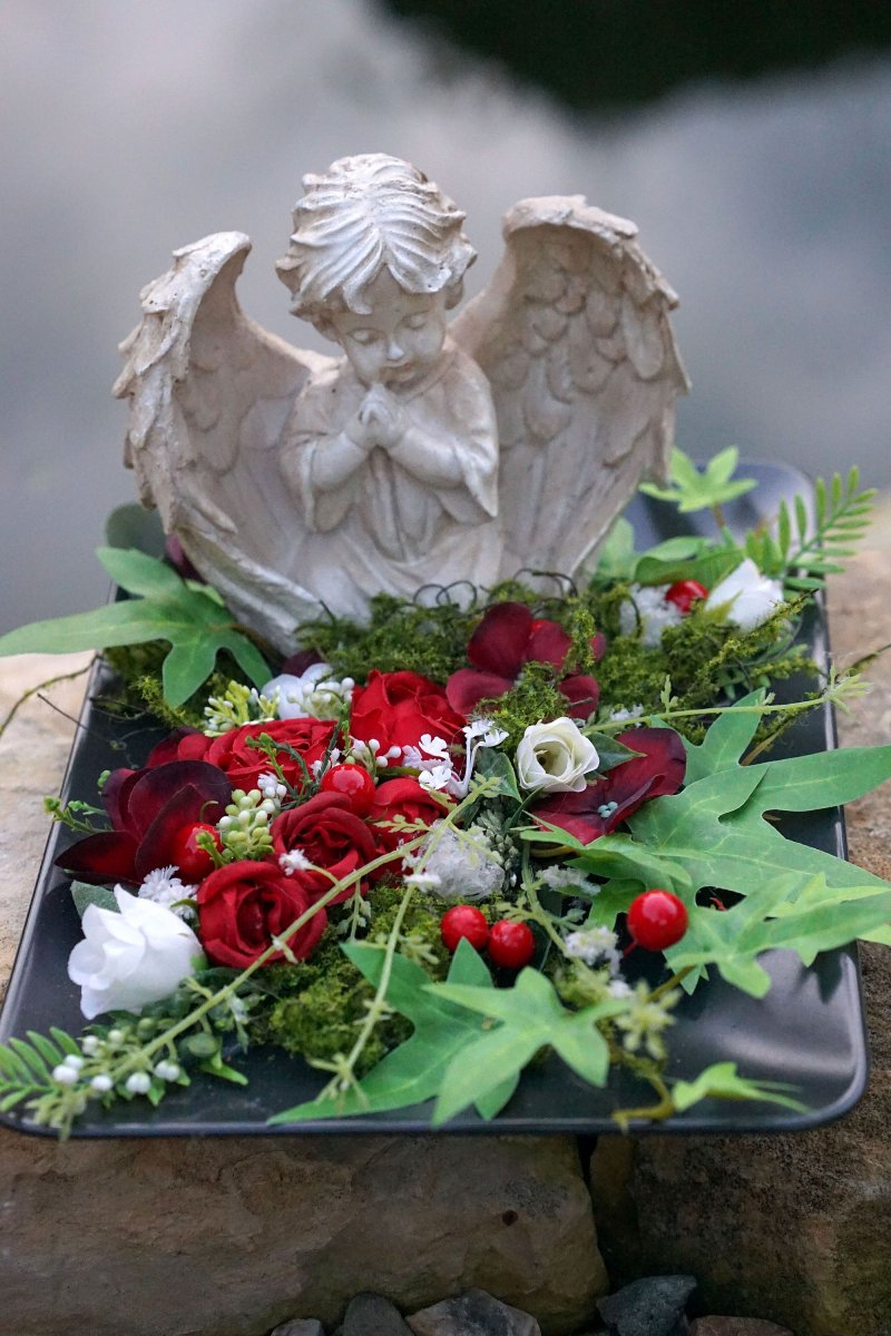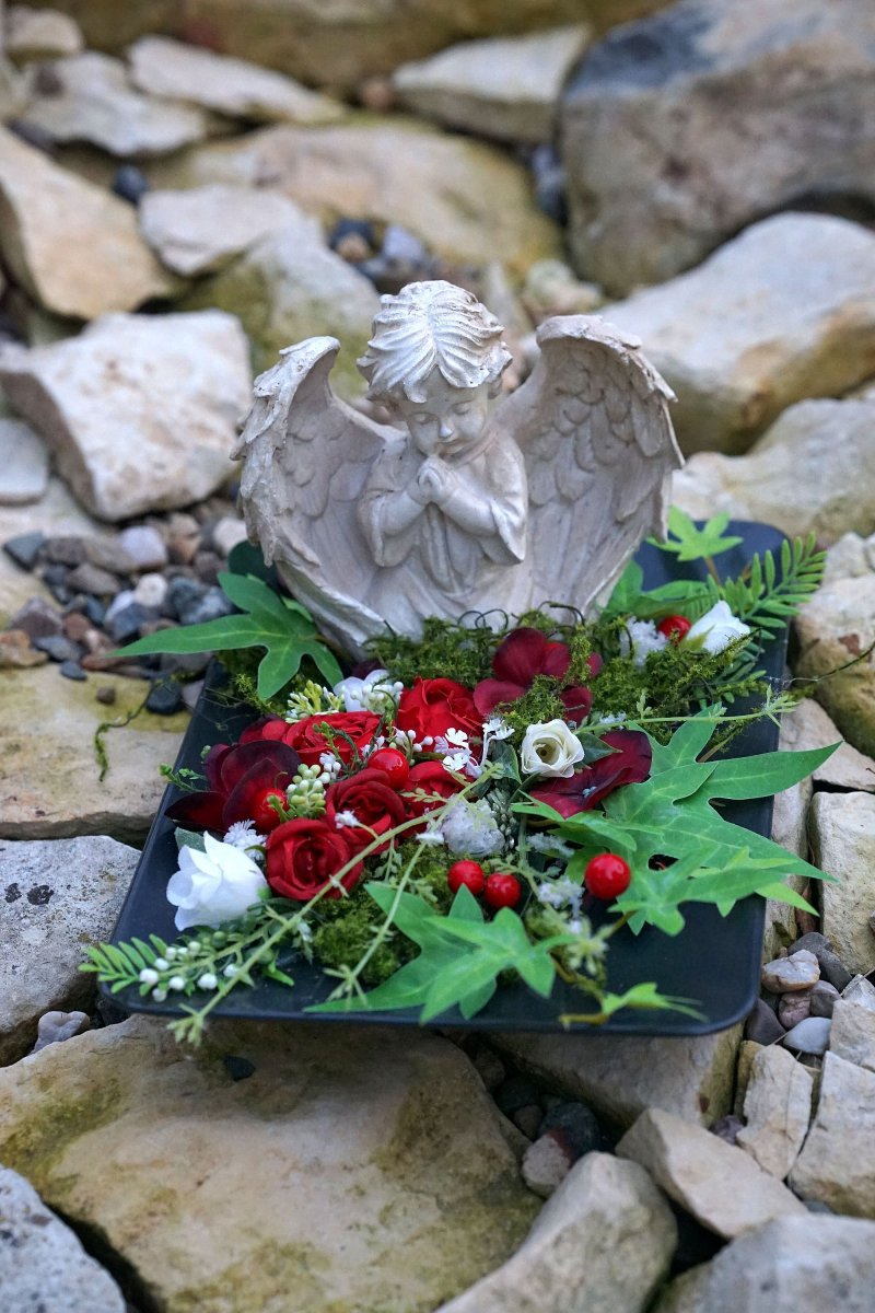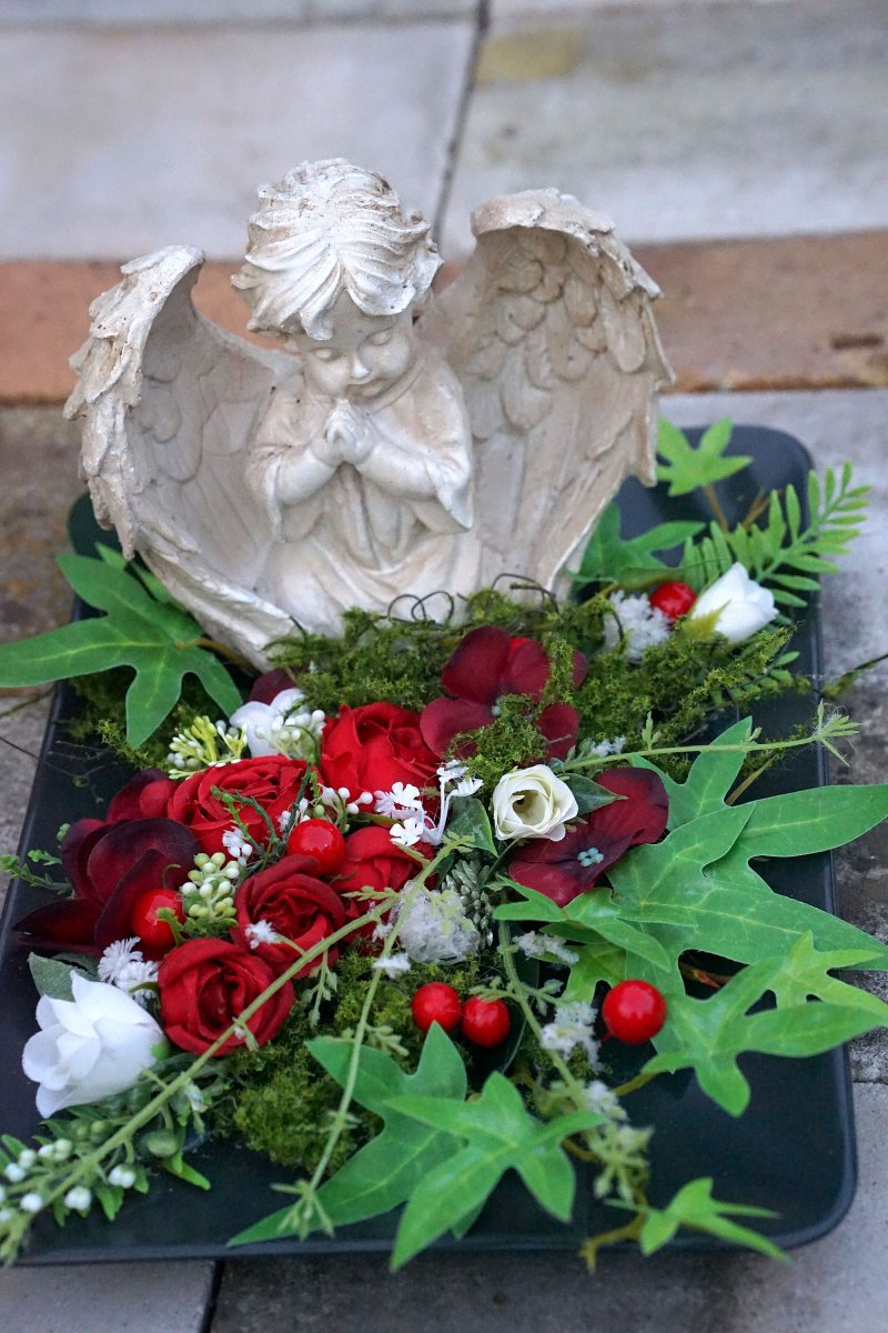 Vzpomínková dekorace na hrob na černém základu. Kombinace bílé, červené a zalené barvy. Květiny jsou látkové, doplněné andělíčkem.
