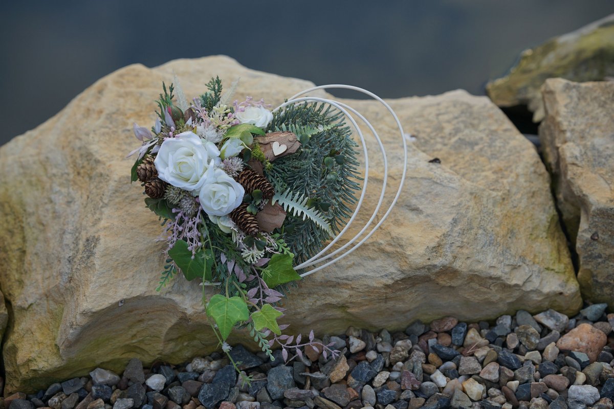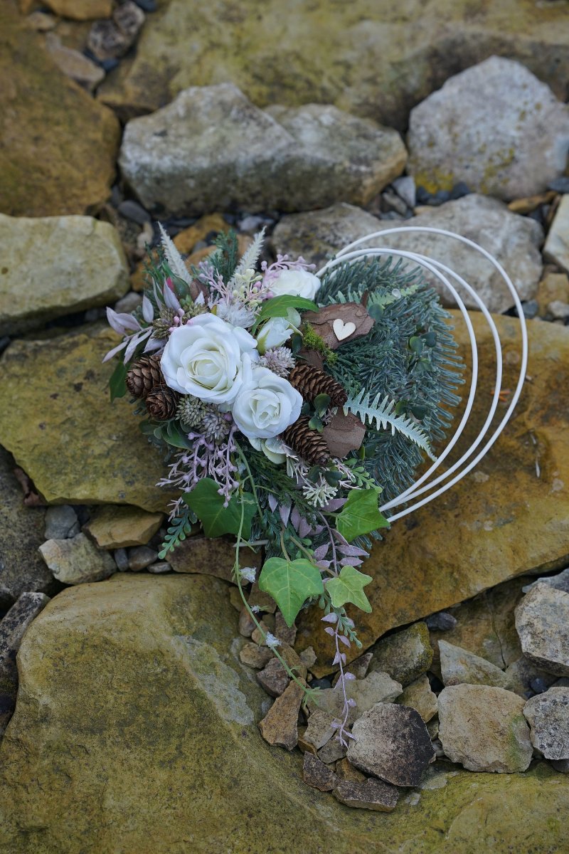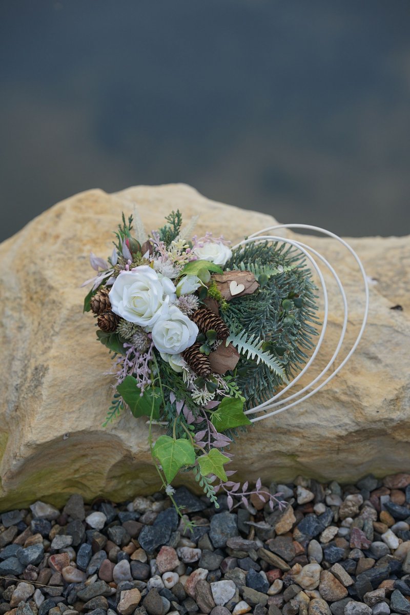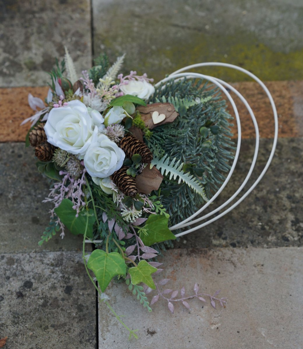 Proutěné srdce zdobené umělým chvojím ve 3D kvalitě, růžičkami, břečťanem a přírodním materiálem. Vše je trvanlivé.