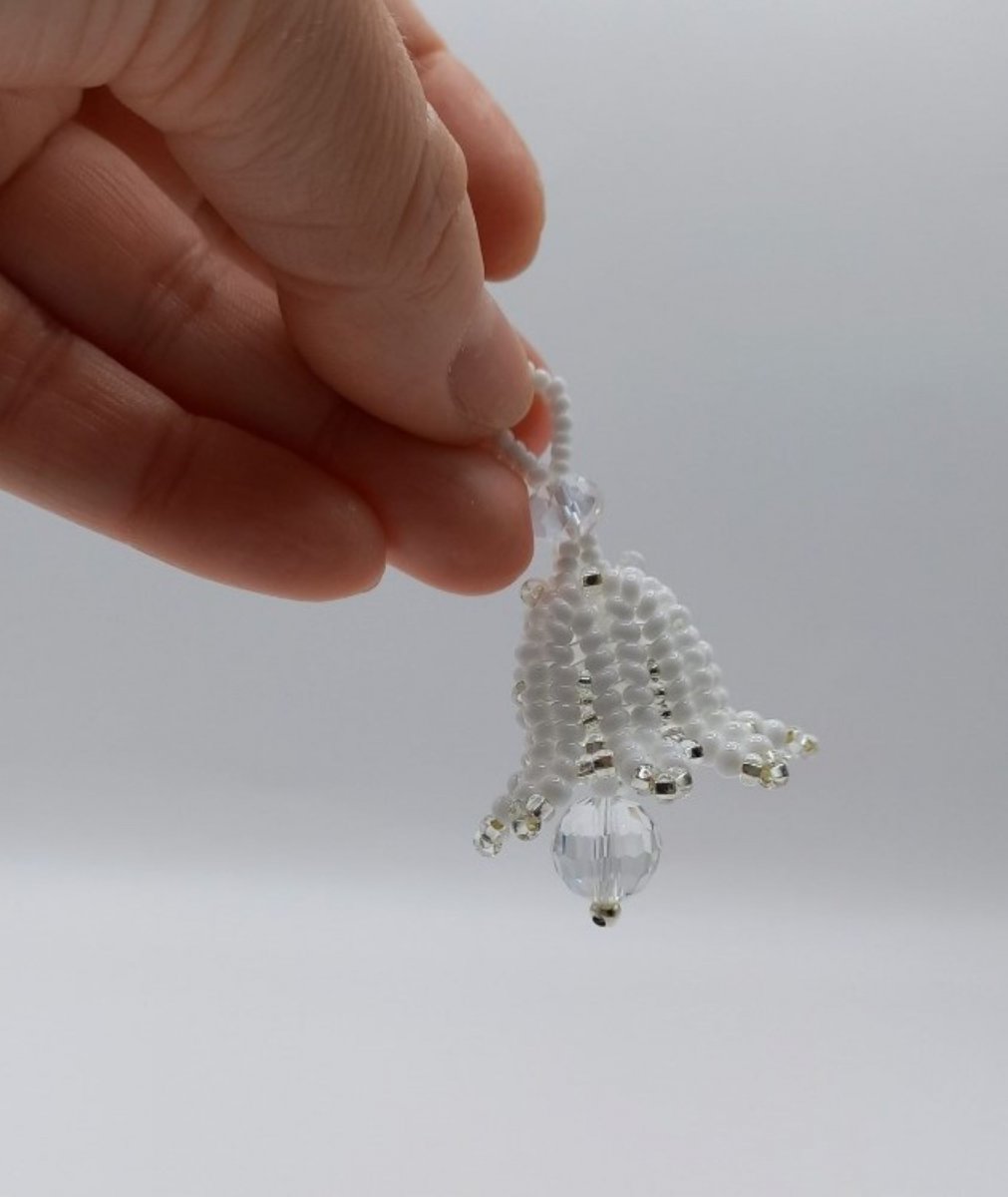 Něžný zvoneček z bílého a stříbrného rokajlu, vytvořený technikou beadweaving, vnese do prostoru jemný třpyt a slavnostní atmosféru. Krásně ozdobí vánoční stromeček, věnec či sváteční stůl. Může být také milým dárkem nebo drobnou pozorností, která po celý rok symbolicky přináší štěstí a ochranu.