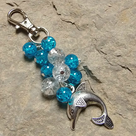 Přívěsek je vyroben z praskaných korálků a delfína v barvě stříbra naketlovaných na řetízek. Je 6 cm dlouhý + 3 cm karabina.